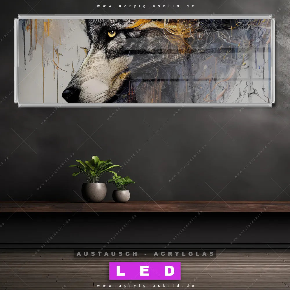 Wechsel-Acrylglas Canvalight® DIA | Abstrakter Wolf in Gold und Grau | Panorama