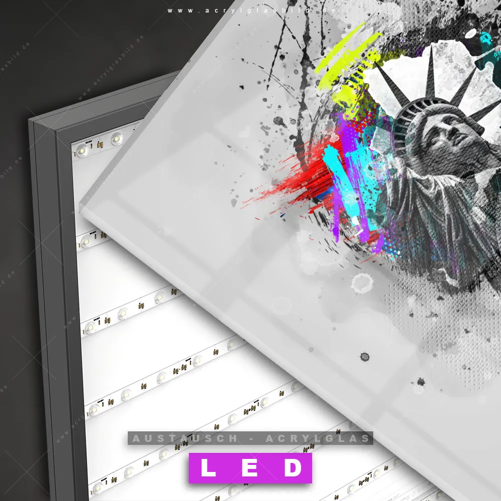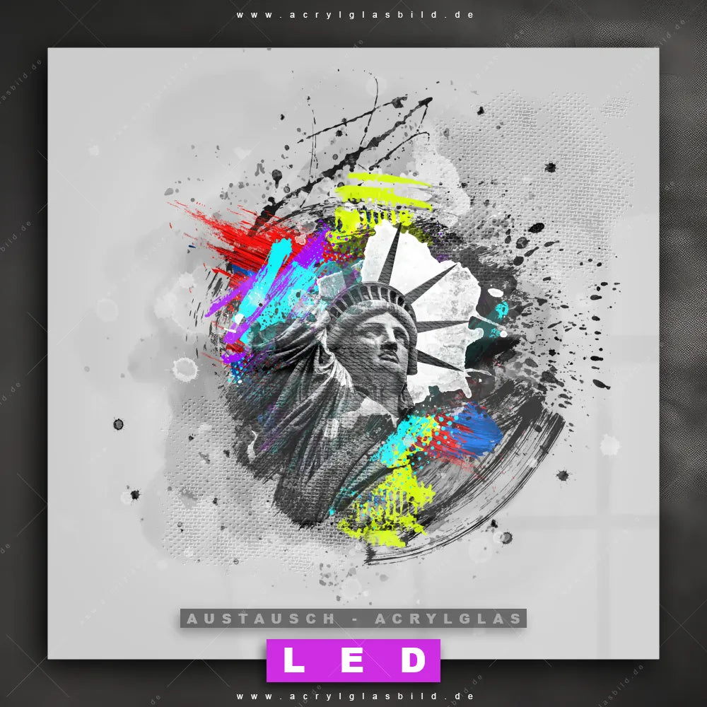 Begriffe wie Freiheitsstatue, Statue of Liberty, Pop Art, Kunst, bunt, Amerika, USA haben dich auf der Suche nach deinem neuen Austausch-Acrylglasbild inspiriert? Dann sollte das Wechsel-Acrylglasbild Freiheitsstatue in Urbanem Stil für dein bereits vorhandenes LED Acrylglasbild Canvalight® DIA den Weg zu dir finden.