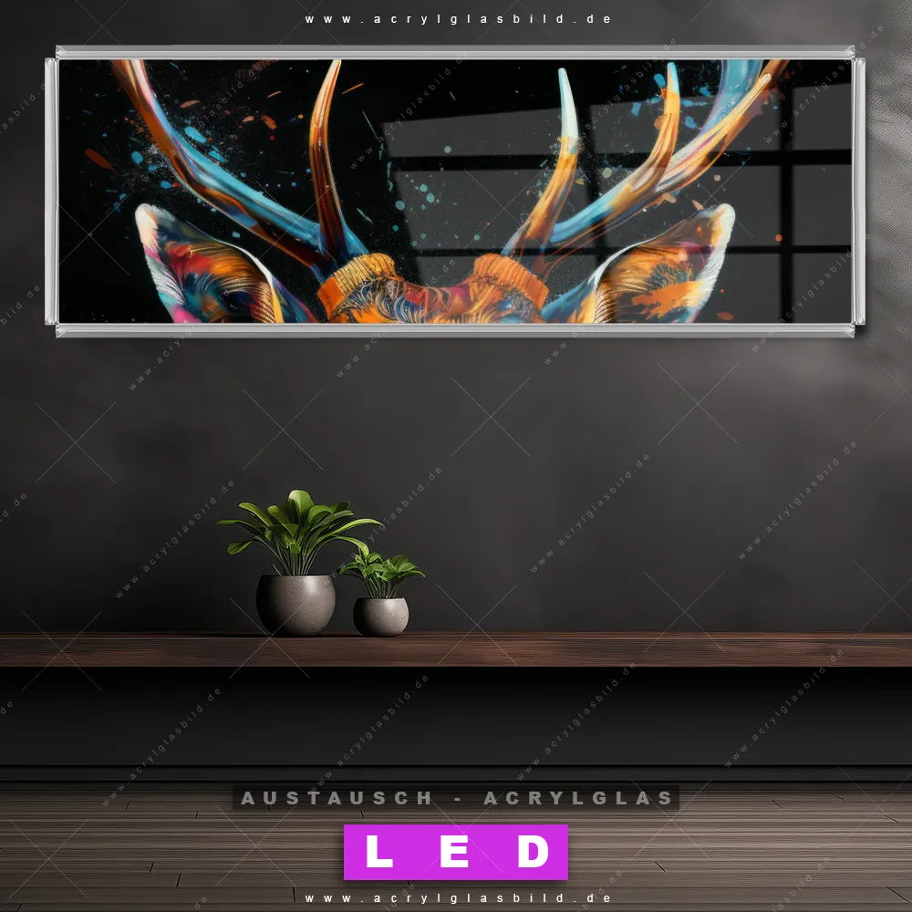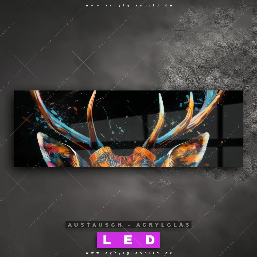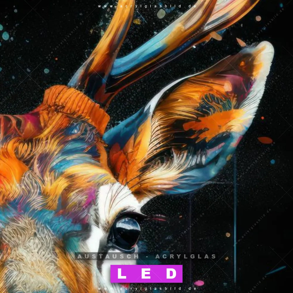 Begriffe wie Hirsch, Natur, Rotwild, Wald, Farbspritzer, Farbexplosion haben dich auf der Suche nach deinem neuen Austausch-Acrylglasbild inspiriert? Dann sollte das Wechsel-Acrylglasbild Abstraktes Porträt eines Hirsches für dein bereits vorhandenes LED Acrylglasbild Canvalight® DIA den Weg zu dir finden.