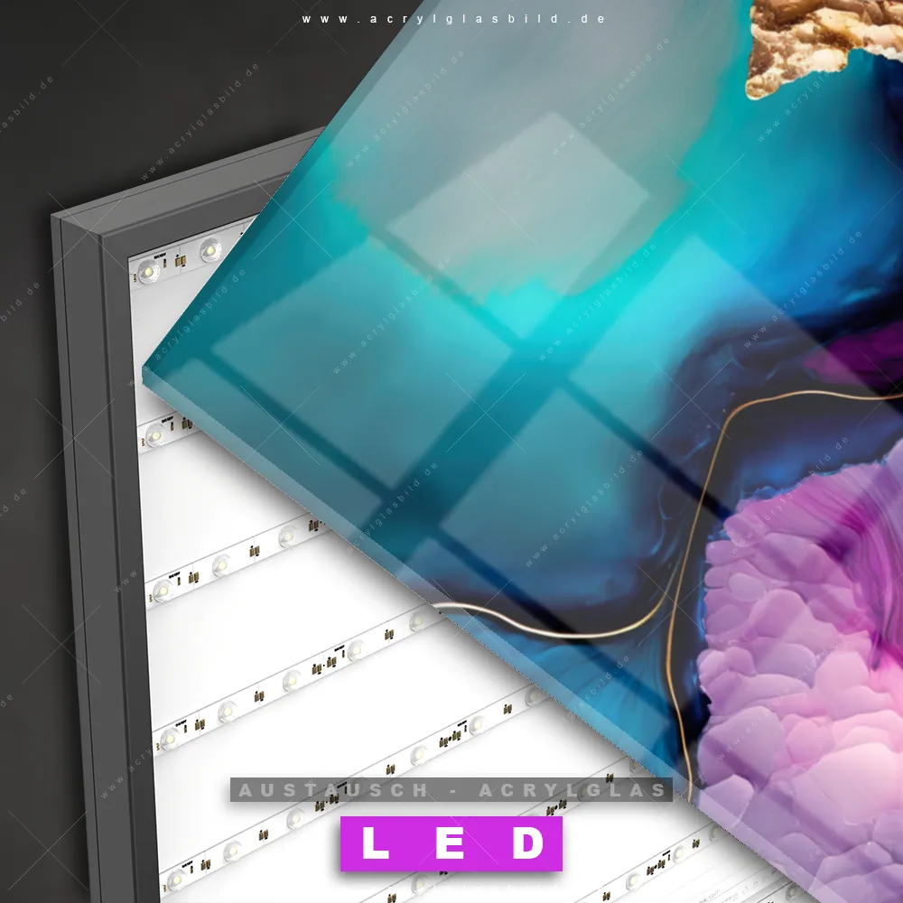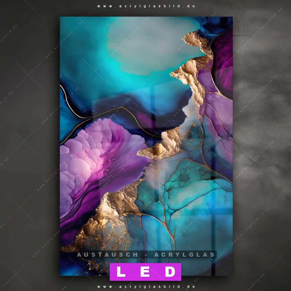 Begriffe wie Marmor, Flüssigkeit, Acryl, flüssig, Farbe, Marmorierung, Tinte, Fluid Art haben dich auf der Suche nach deinem neuen Austausch-Acrylglasbild inspiriert? Dann sollte das Wechsel-Acrylglasbild Fluid Art in lila, blau & gold für dein bereits vorhandenes LED Acrylglasbild Canvalight® DIA den Weg zu dir finden.