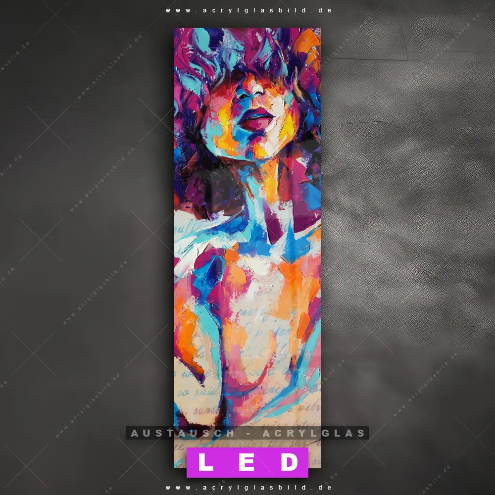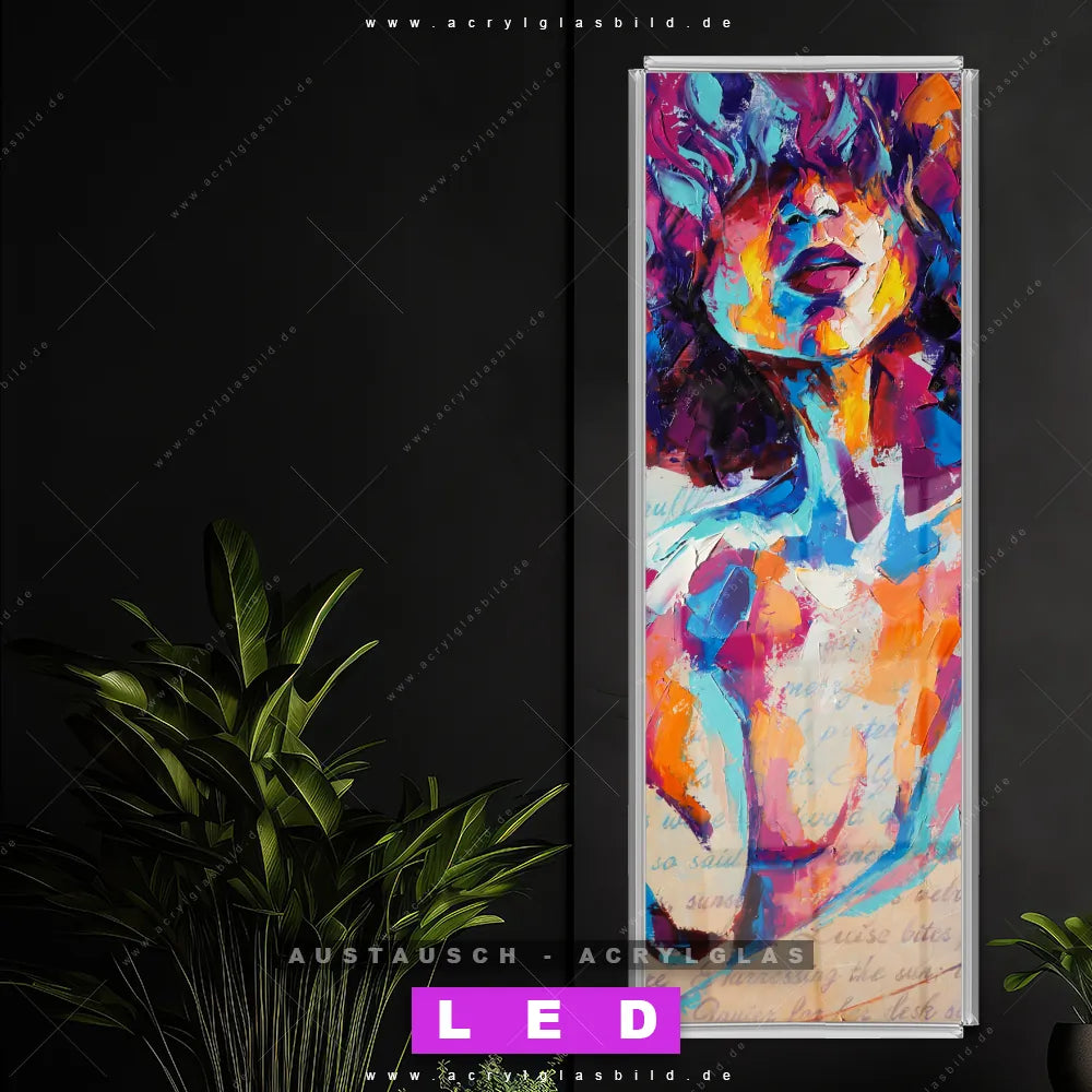 Begriffe wie Abstrakt, Modern, Kunst, Gemälde, Ölfarbe, Leinwand, Frau, Portrait, Geheimnis, Lippen, Schönheit, Gesicht haben dich auf der Suche nach deinem neuen Austausch-Acrylglasbild inspiriert? Dann sollte das Wechsel-Acrylglasbild versteckter Blick für dein bereits vorhandenes LED Acrylglasbild Canvalight® DIA den Weg zu dir finden.