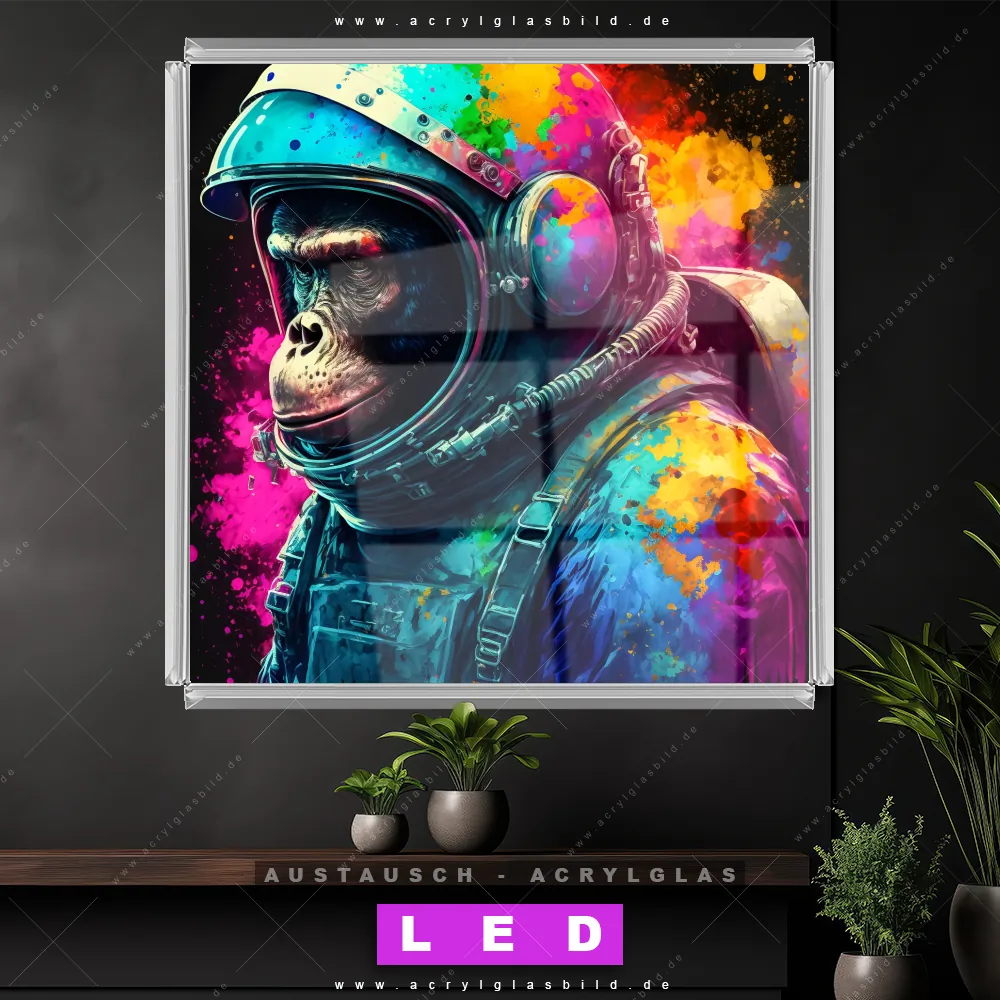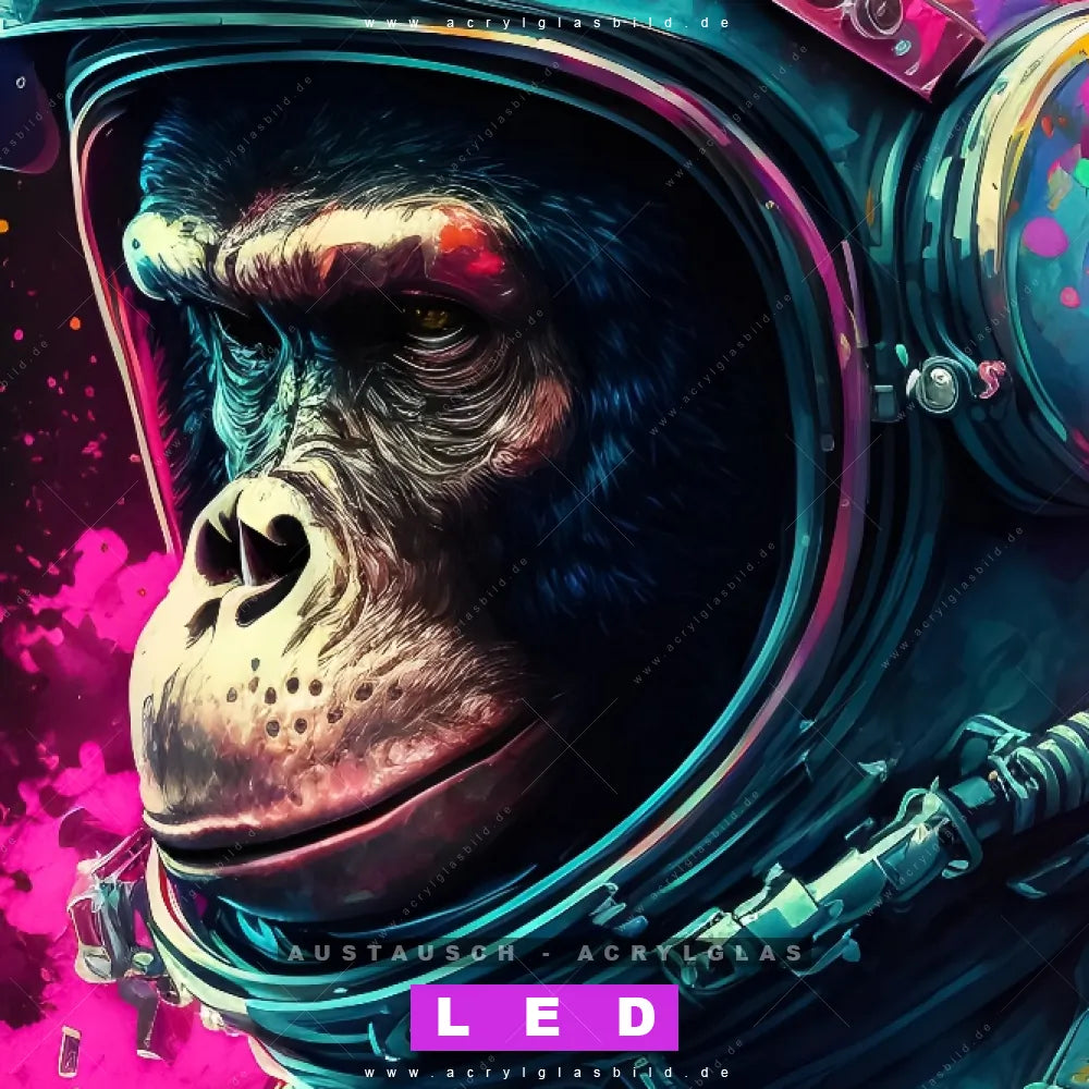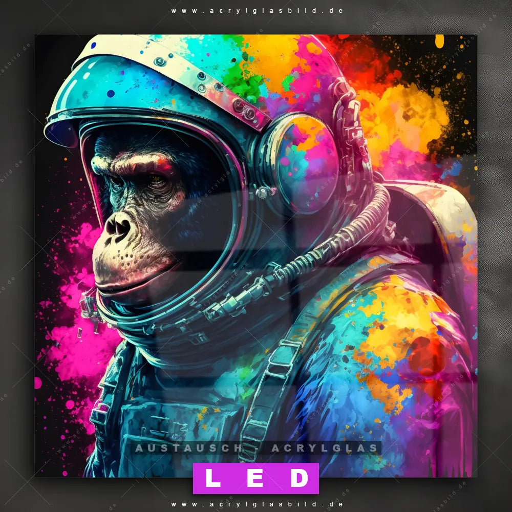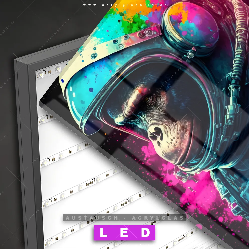 Begriffe wie Tier, Affe, Monkey, Chimpanzee, Schimpanse, Farbe, Farbspritzer, Austronaut, Weltall, Space haben dich auf der Suche nach deinem neuen Austausch-Acrylglasbild inspiriert? Dann sollte das Wechsel-Acrylglasbild Schimpanse in bunten Farben als Astronaut für dein bereits vorhandenes LED Acrylglasbild Canvalight® DIA den Weg zu dir finden.
