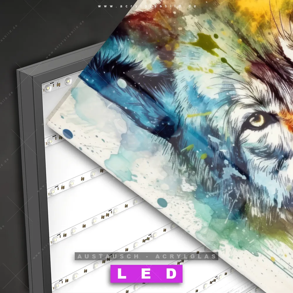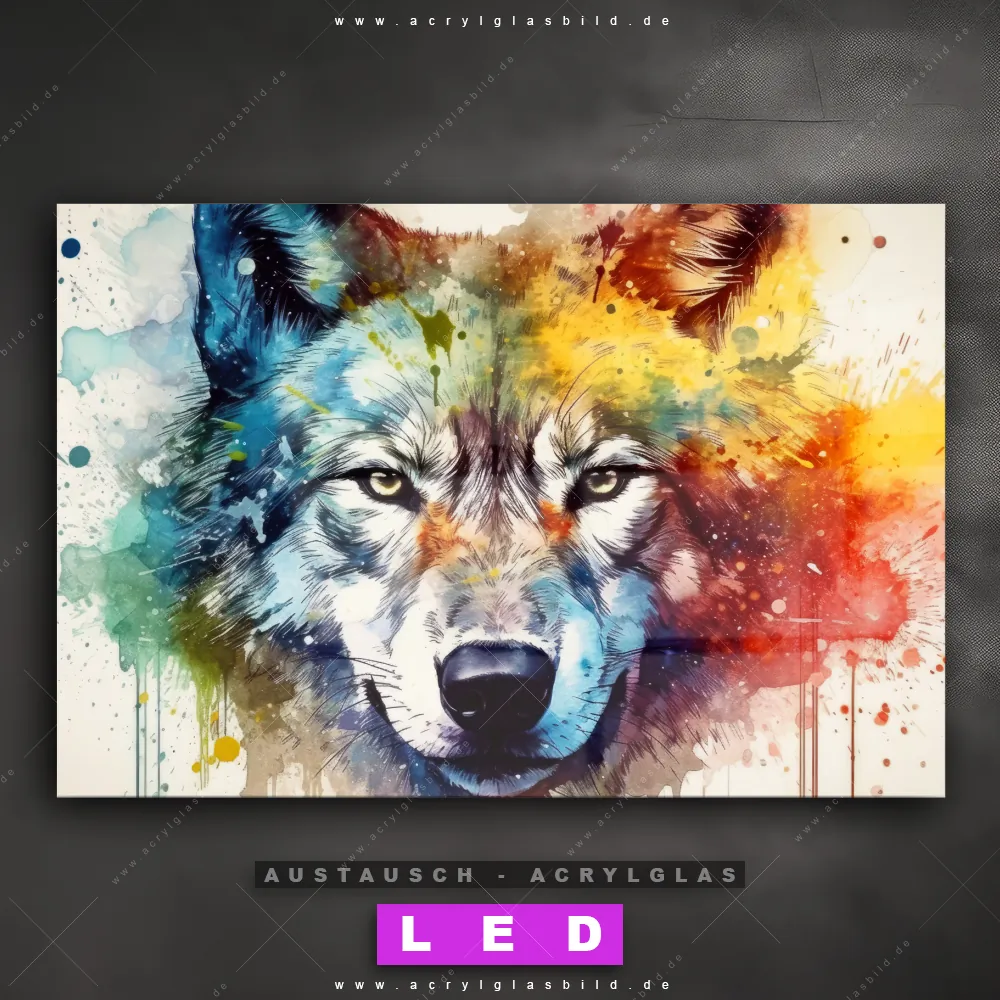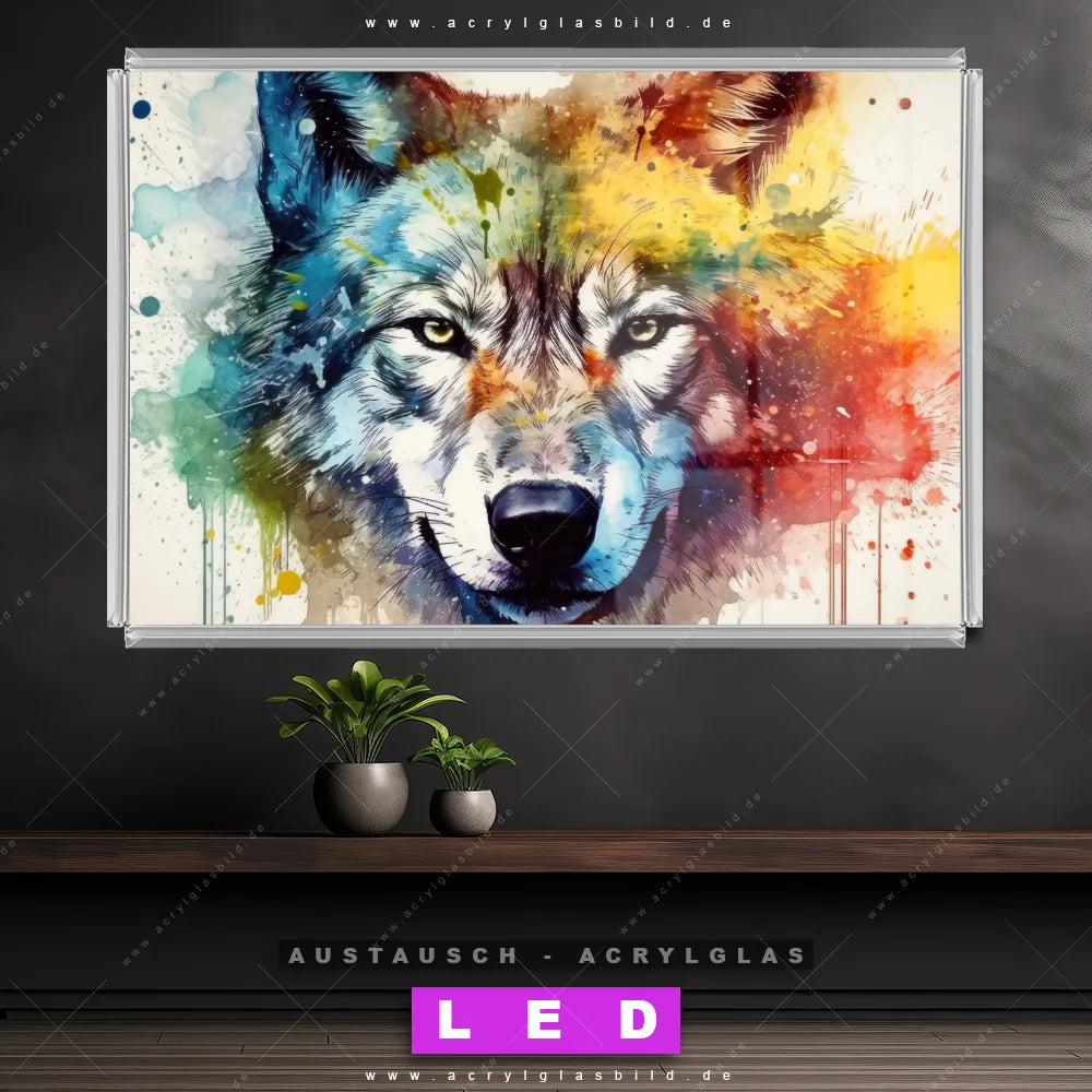 Wechsel-Acrylglas Canvalight® DIA | Wolf mit bunten Farbspritzern No. 2 | Querformat