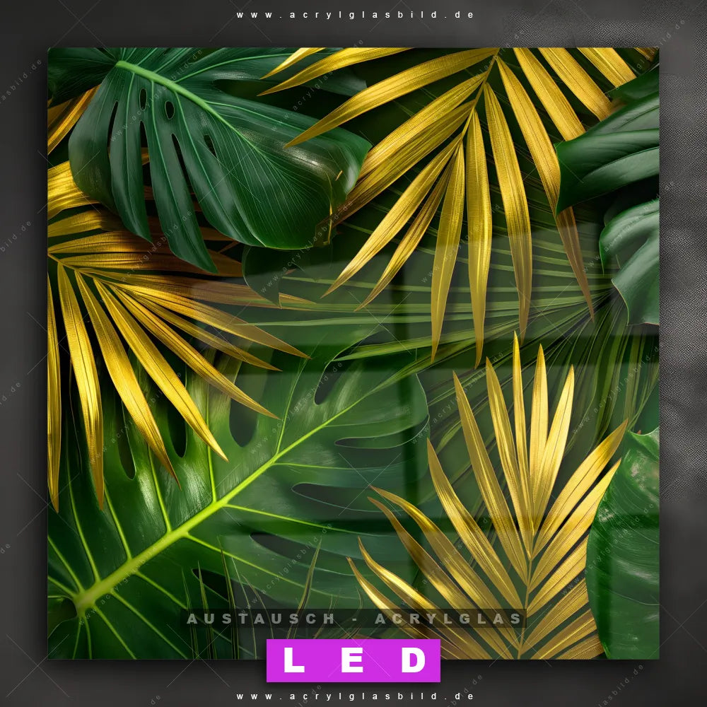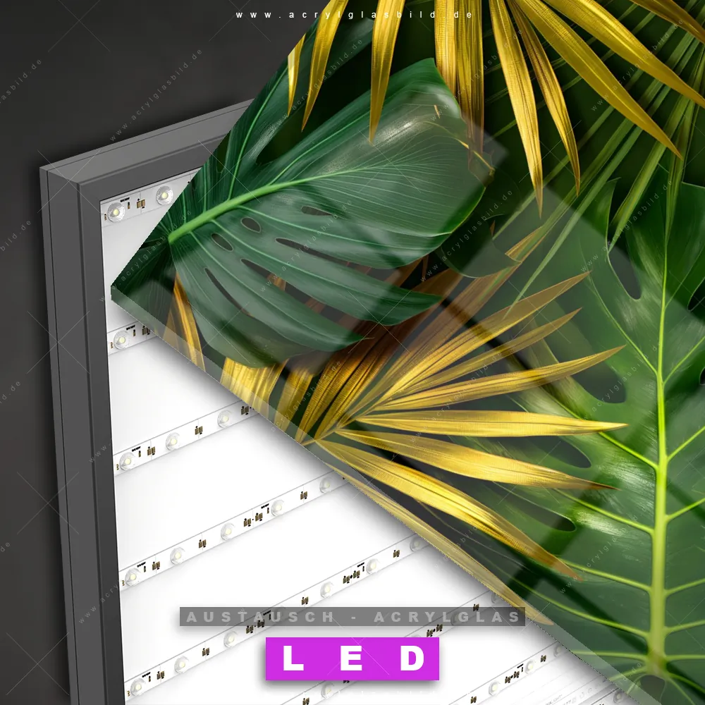 Begriffe wie Monstera, Palmenblätter, Blätter, Pflanze, Natur, Nahaufnahme, Laub, Dschungel haben dich auf der Suche nach deinem neuen Austausch-Acrylglasbild inspiriert? Dann sollte das Wechsel-Acrylglasbild Tropische Blätter in Gold für dein bereits vorhandenes LED Acrylglasbild Canvalight® DIA den Weg zu dir finden.