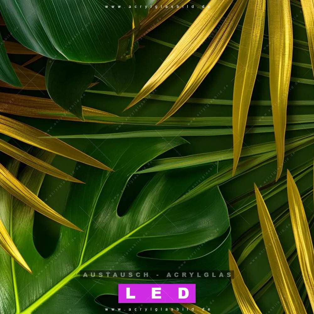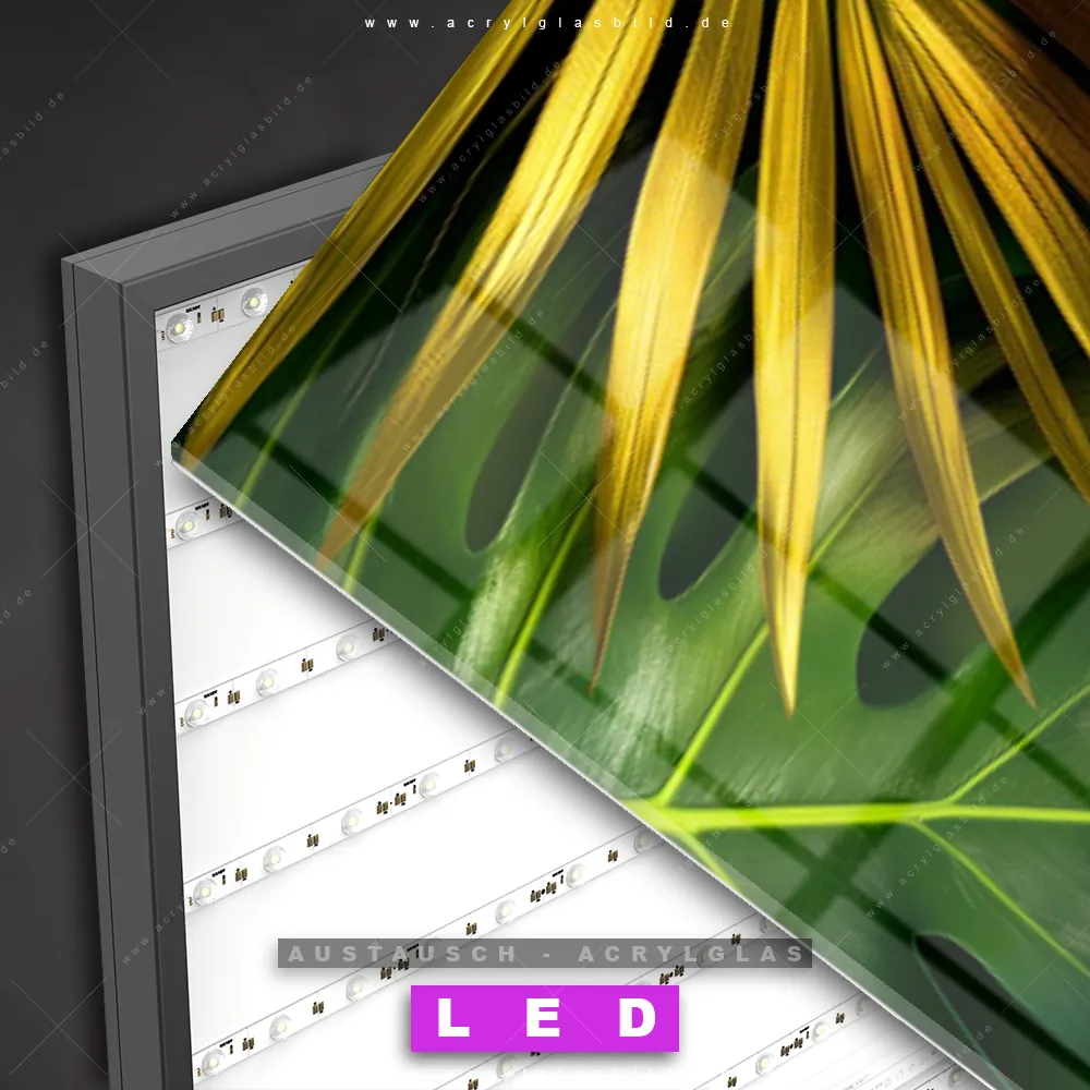 Begriffe wie Monstera, Palmenblätter, Blätter, Pflanze, Natur, Nahaufnahme, Laub, Dschungel haben dich auf der Suche nach deinem neuen Austausch-Acrylglasbild inspiriert? Dann sollte das Wechsel-Acrylglasbild Tropische Blätter in Gold für dein bereits vorhandenes LED Acrylglasbild Canvalight® DIA den Weg zu dir finden.