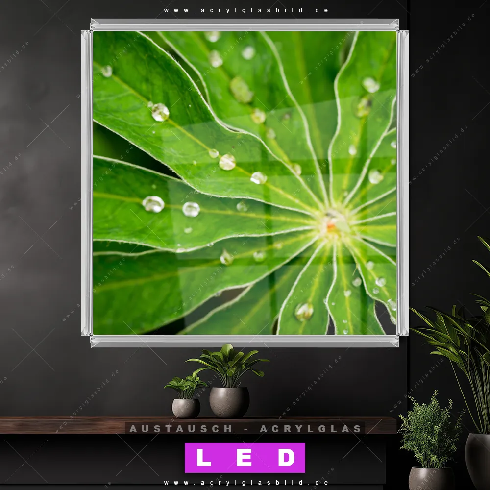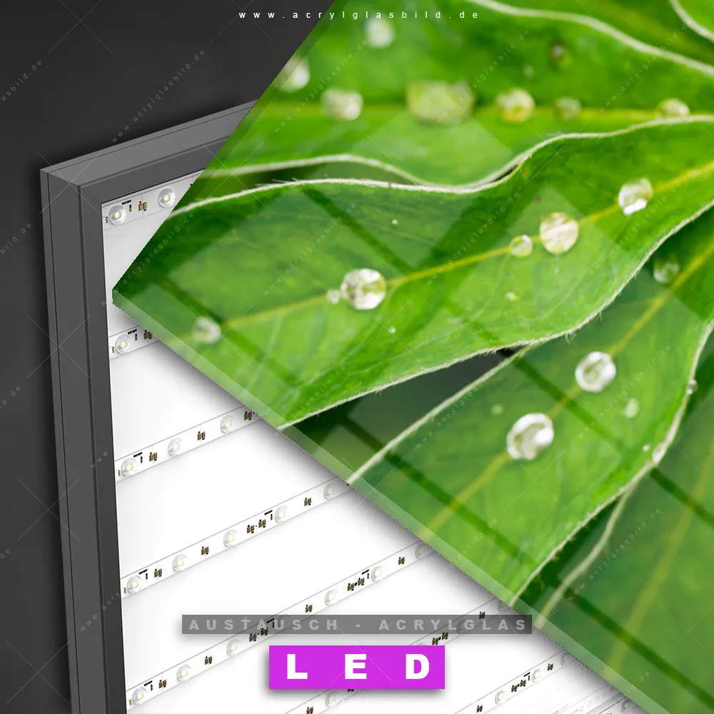 Begriffe wie Pflanze, Natur, Nahaufnahme, Draufsicht, Blatt, Blätter, Tropfen, Wassertropfen haben dich auf der Suche nach deinem neuen Austausch-Acrylglasbild inspiriert? Dann sollte das Wechsel-Acrylglasbild Pflanze mit Regentropfen für dein bereits vorhandenes LED Acrylglasbild Canvalight® DIA den Weg zu dir finden.