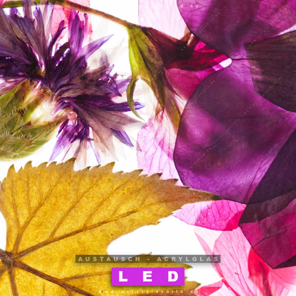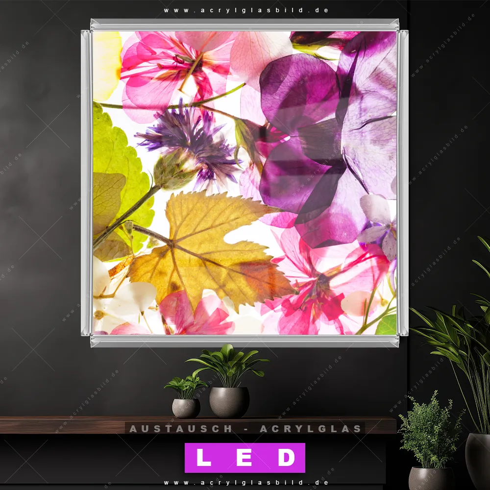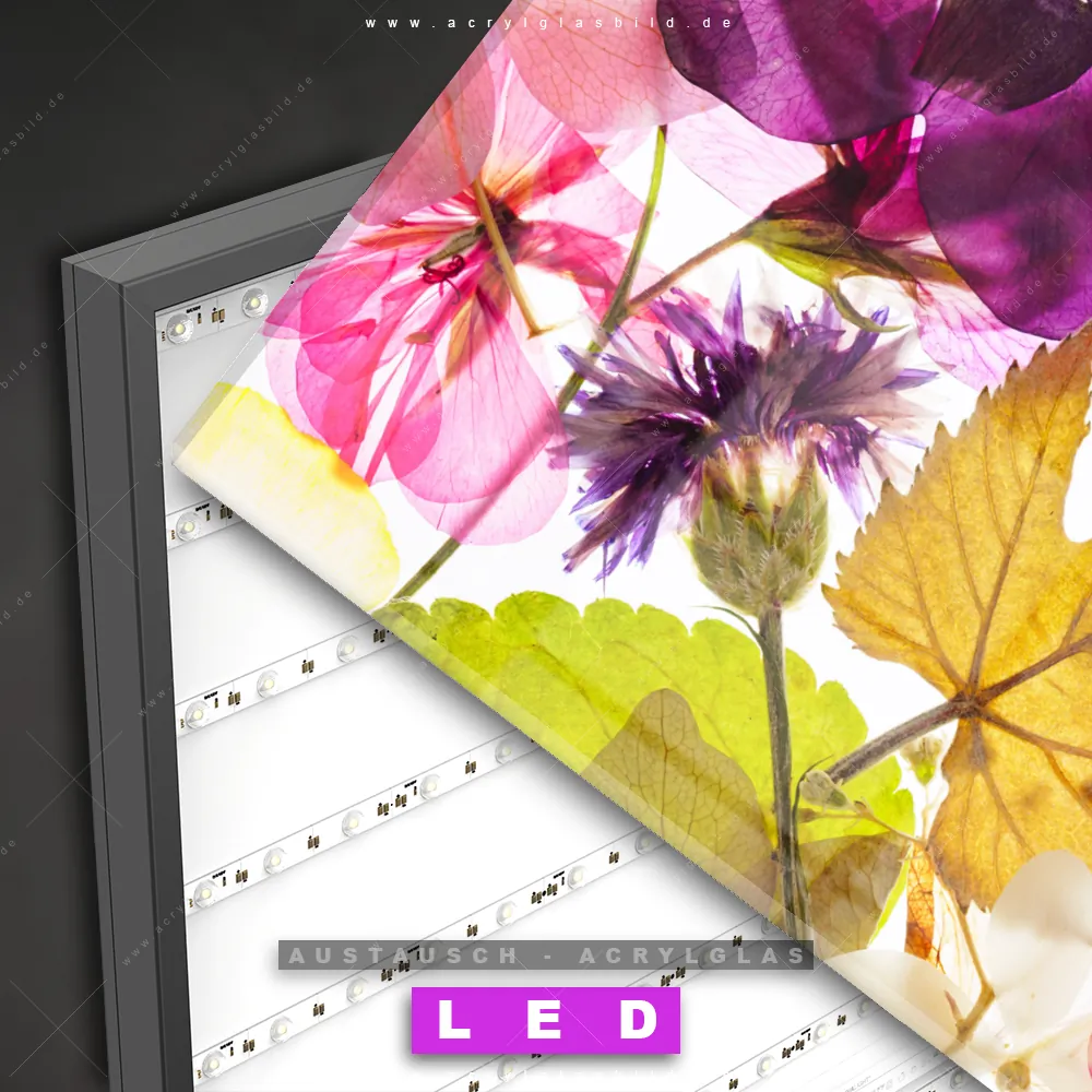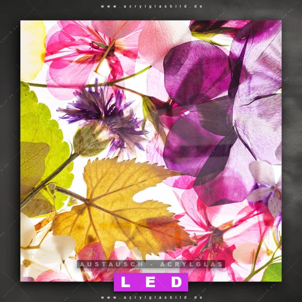 Begriffe wie Pflanze, Natur, Blüte, Nahaufnahme, Draufsicht, vintage, Blumen, Blätter haben dich auf der Suche nach deinem neuen Austausch-Acrylglasbild inspiriert? Dann sollte das Wechsel-Acrylglasbild farbenfrohe Blumen für dein bereits vorhandenes LED Acrylglasbild Canvalight® DIA den Weg zu dir finden.