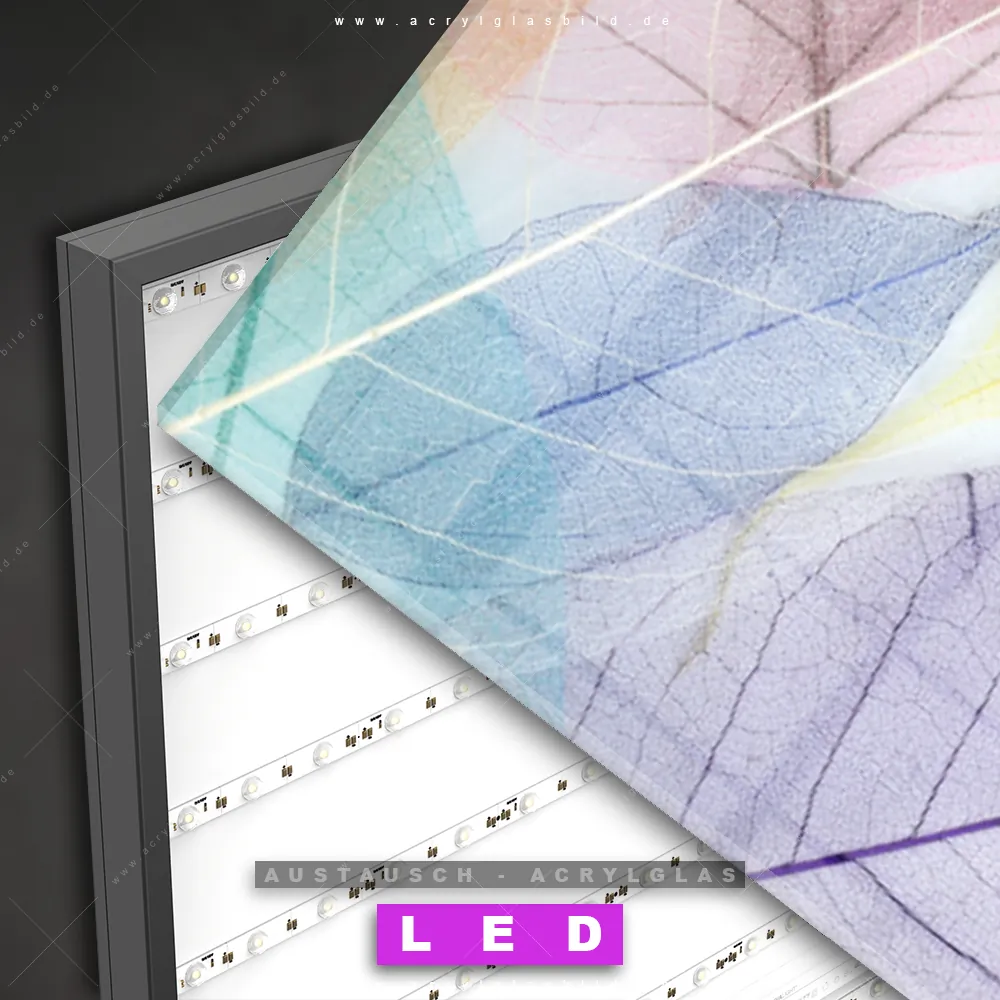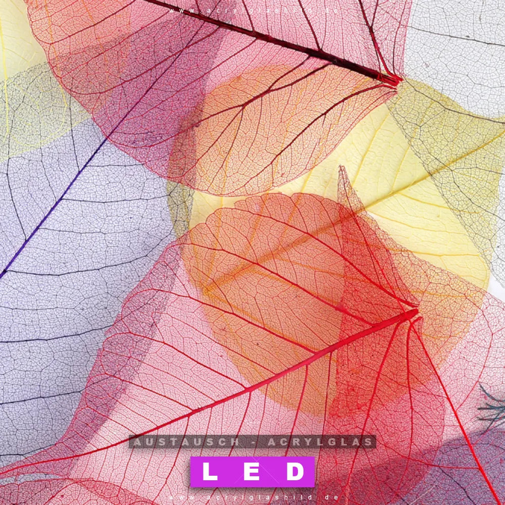 Begriffe wie Blätter, Pflanze, Natur, Nahaufnahme, Vogelperspektive, Draufsicht, Blatt haben dich auf der Suche nach deinem neuen Austausch-Acrylglasbild inspiriert? Dann sollte das Wechsel-Acrylglasbild farbenfrohe Blätter für dein bereits vorhandenes LED Acrylglasbild Canvalight® DIA den Weg zu dir finden.
