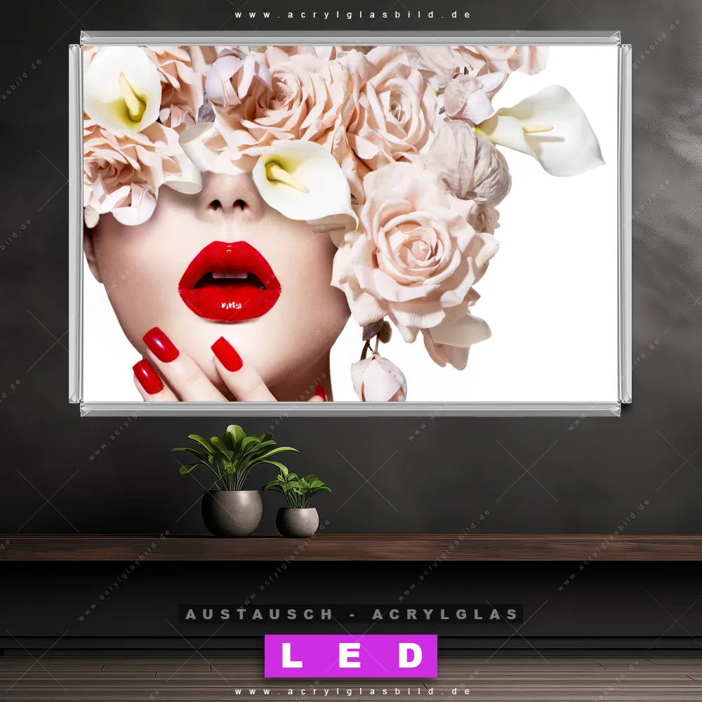 Begriffe wie Menschen & Blumen, Frau, Porträt, modern, Beauty, Gesicht, Blumen, Blüten, Schönheit, Mode, Lippen haben dich auf der Suche nach deinem neuen Austausch-Acrylglasbild inspiriert? Dann sollte das Wechsel-Acrylglasbild verführerische Lippen für dein bereits vorhandenes LED Acrylglasbild Canvalight® DIA den Weg zu dir finden.