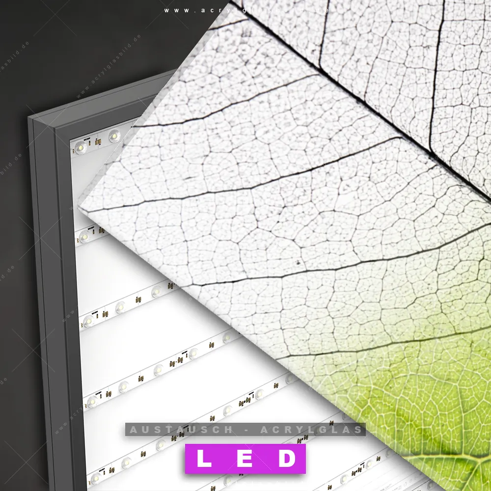 Begriffe wie Blätter, Pflanze, Natur, Nahaufnahme, Vogelperspektive, Draufsicht, Blatt, Makro, Close Up, Blattadern haben dich auf der Suche nach deinem neuen Austausch-Acrylglasbild inspiriert? Dann sollte das Wechsel-Acrylglasbild Laubblatt in weiß/grün für dein bereits vorhandenes LED Acrylglasbild Canvalight® DIA den Weg zu dir finden.