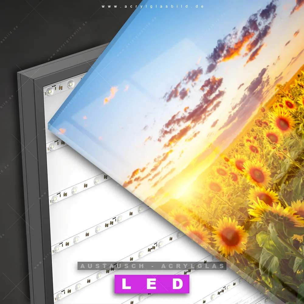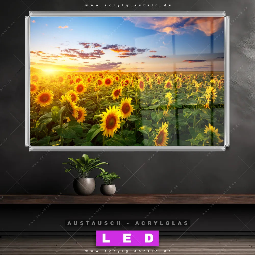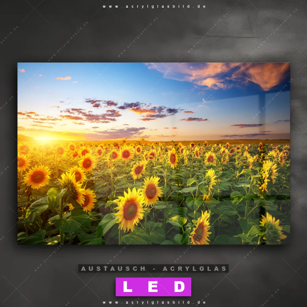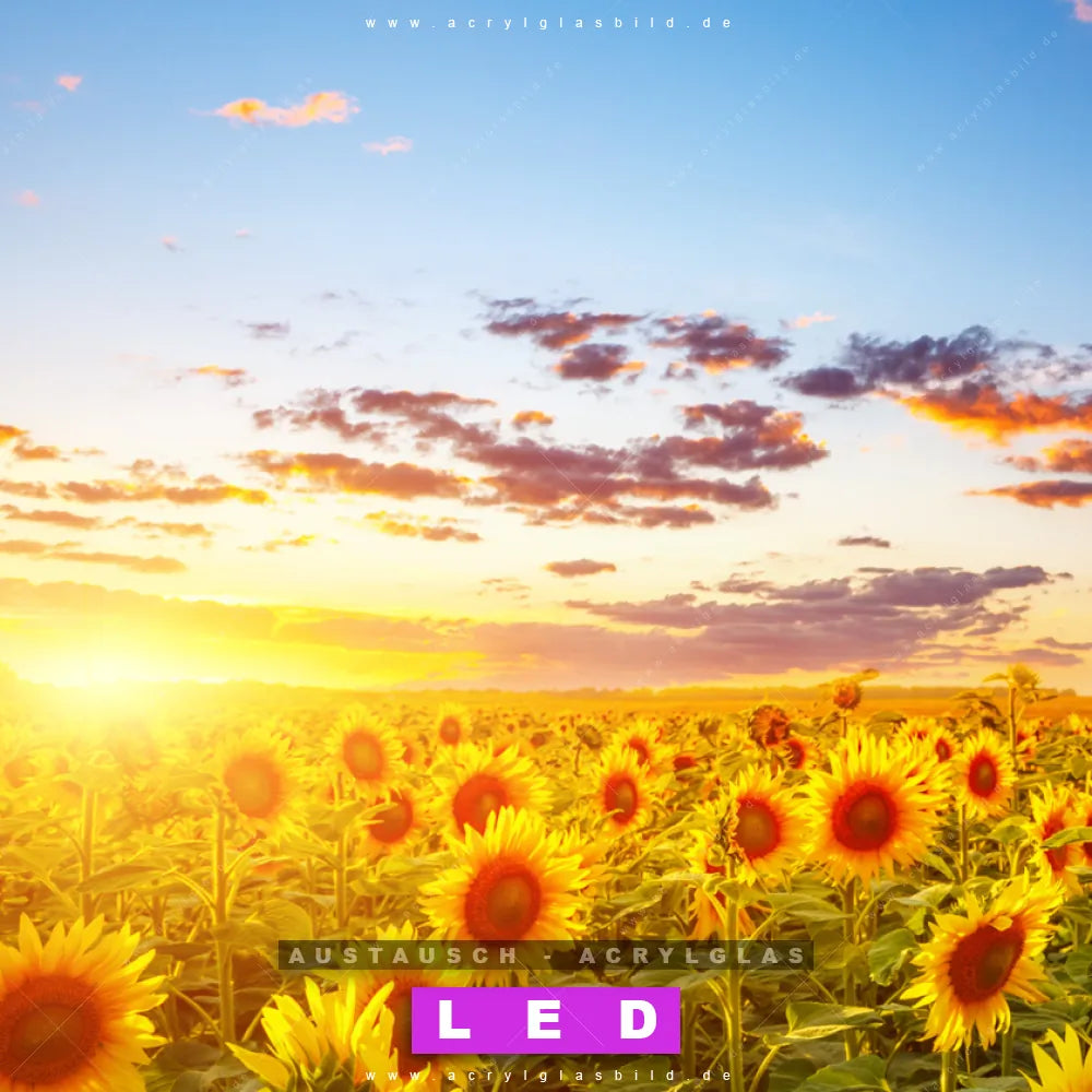 Begriffe wie Natur, Feld, Blumen, Blüten, Pflanzen, Blumenwiese, Sonnenblume, Sonnenuntergang haben dich auf der Suche nach deinem neuen Austausch-Acrylglasbild inspiriert? Dann sollte das Wechsel-Acrylglasbild Sonnenblumen in der Abenddämmerung für dein bereits vorhandenes LED Acrylglasbild Canvalight® DIA den Weg zu dir finden.