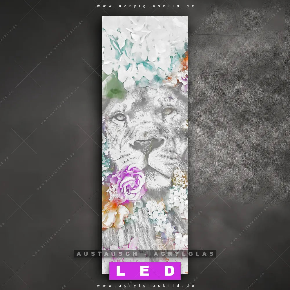 Begriffe wie Tier, Blumen, Kunst, Aquarell, Löwe, Lion, Raubkatze, Blüten haben dich auf der Suche nach deinem neuen Austausch-Acrylglasbild inspiriert? Dann sollte das Wechsel-Acrylglasbild Löwenporträt aus pastellfarbenen Blumen für dein bereits vorhandenes LED Acrylglasbild Canvalight® DIA den Weg zu dir finden.