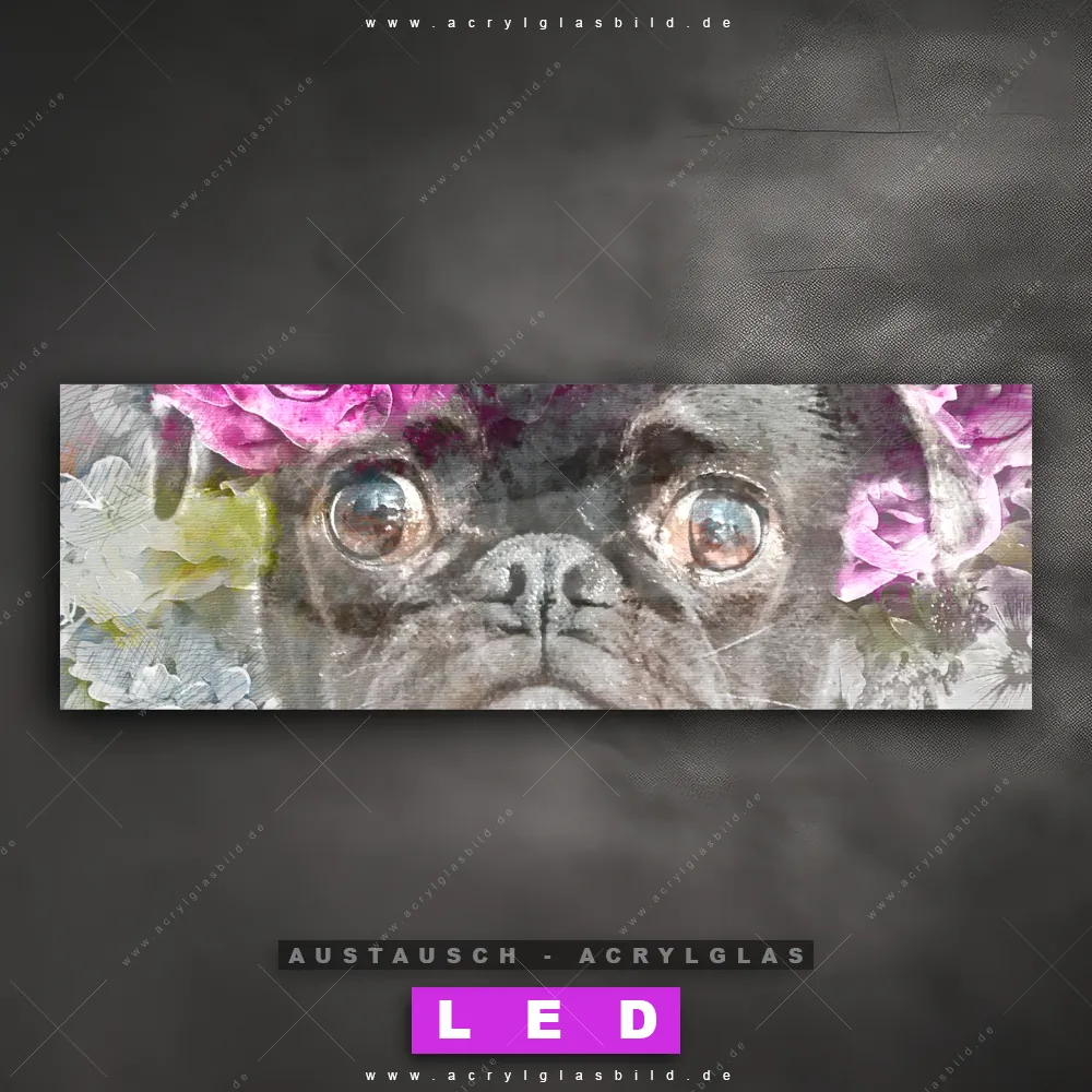 Begriffe wie Tiere & Blumen, Mops, Hund, Tier, Blumen, Blüten haben dich auf der Suche nach deinem neuen Austausch-Acrylglasbild inspiriert? Dann sollte das Wechsel-Acrylglasbild Mops umgeben von einem Aquarellblumen für dein bereits vorhandenes LED Acrylglasbild Canvalight® DIA den Weg zu dir finden.
