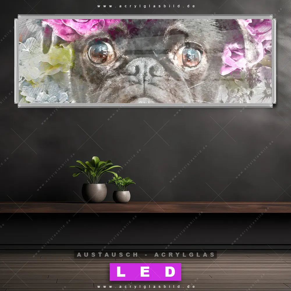 Wechsel-Acrylglas Canvalight® DIA | Mops & Blumen | Panorama