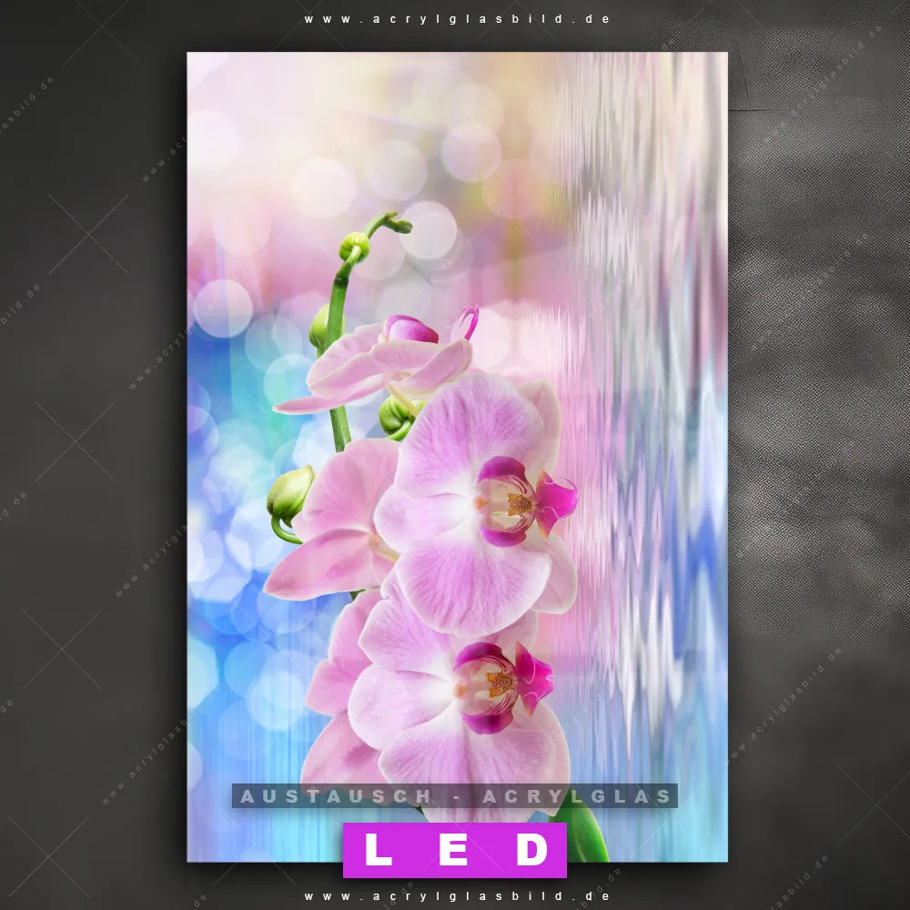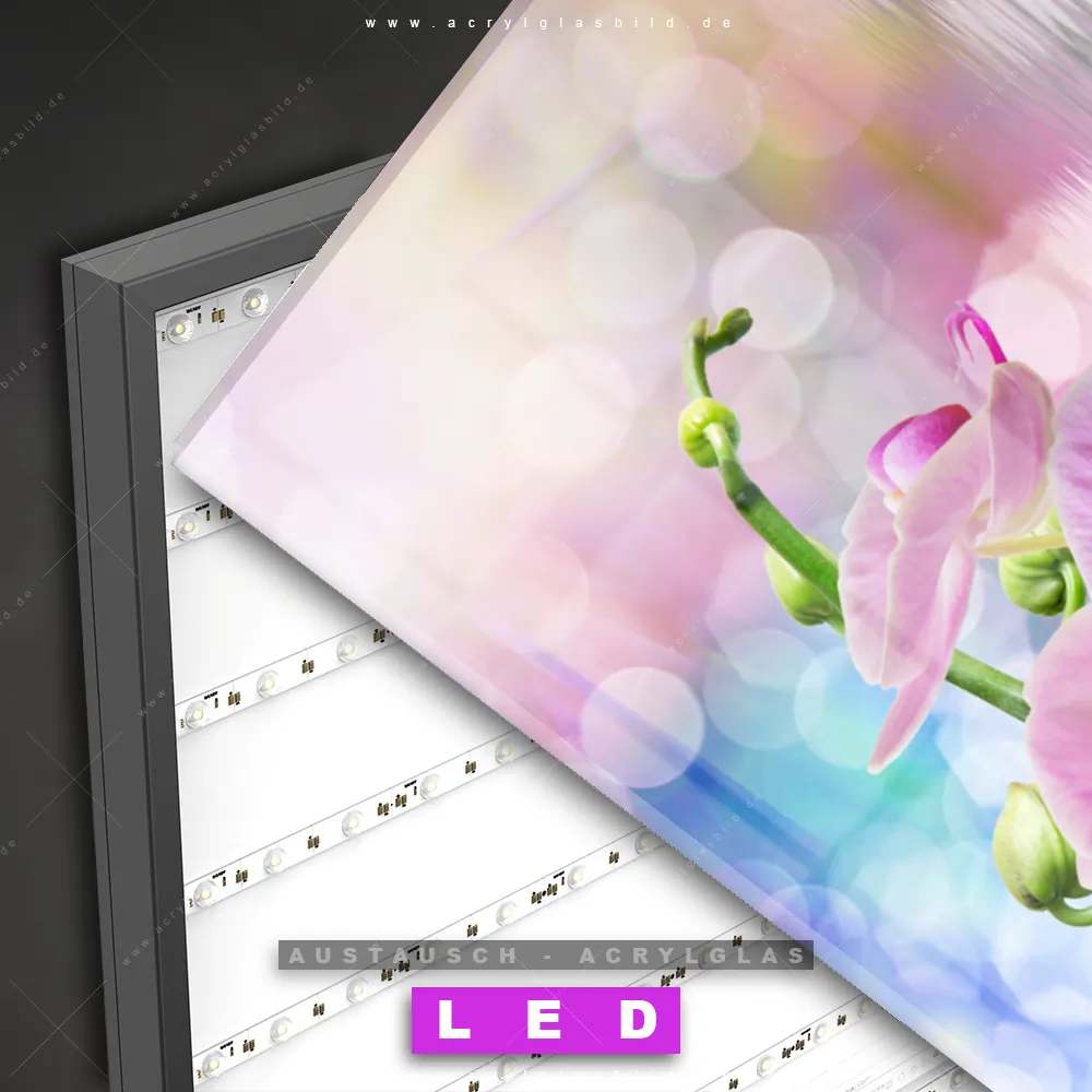 Begriffe wie Blume, Blüte, Pflanze, Tropfen, Orchidee, Wasser, Spiegelung, Wasserspiegelung haben dich auf der Suche nach deinem neuen Austausch-Acrylglasbild inspiriert? Dann sollte das Wechsel-Acrylglasbild rosafarbene Orchideenblüten für dein bereits vorhandenes LED Acrylglasbild Canvalight® DIA den Weg zu dir finden.