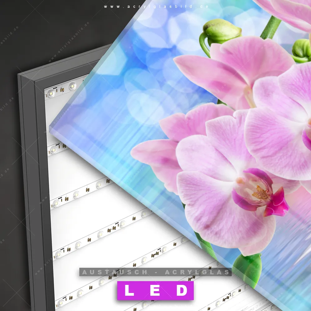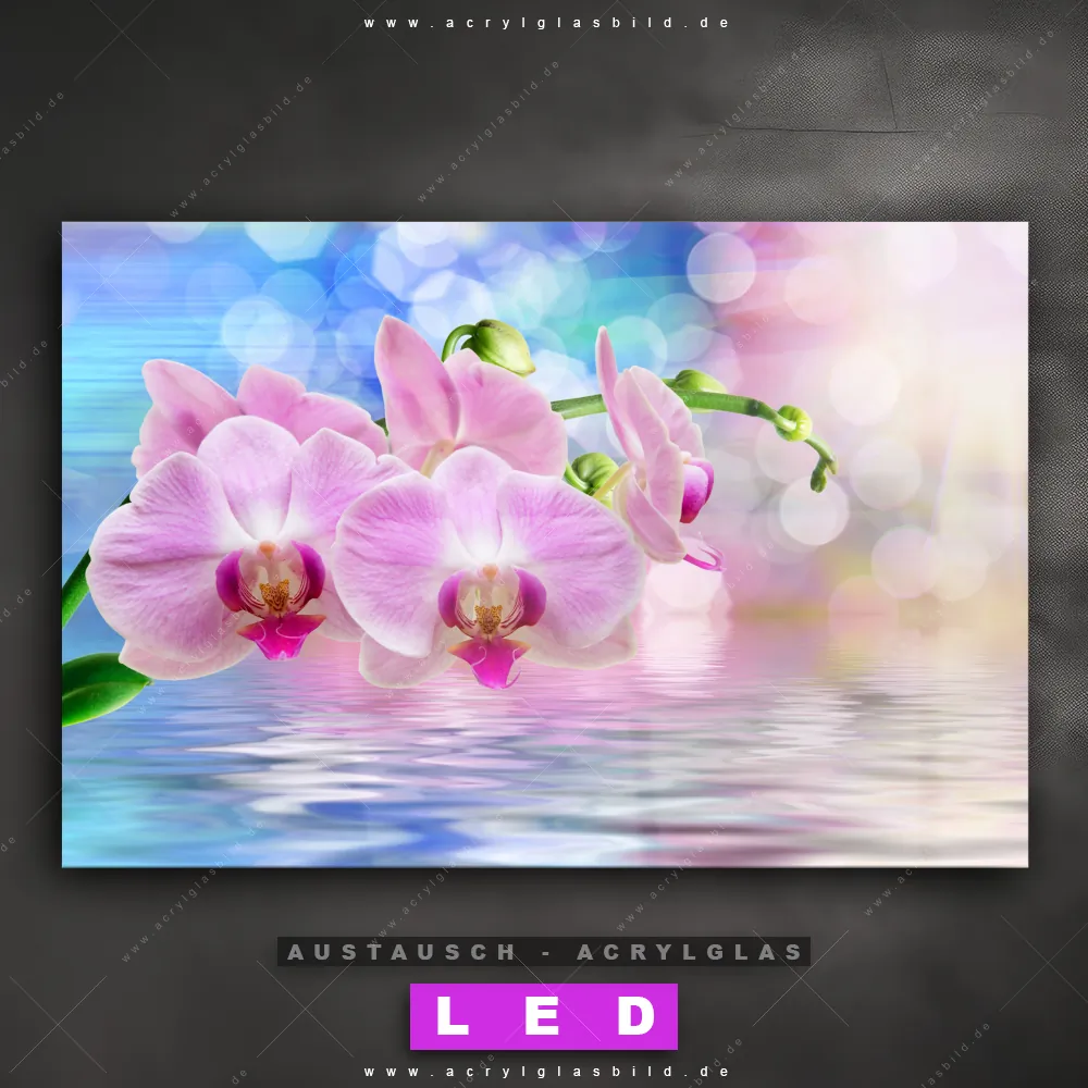 Begriffe wie Blume, Blüte, Pflanze, Tropfen, Orchidee, Wasser, Spiegelung, Wasserspiegelung haben dich auf der Suche nach deinem neuen Austausch-Acrylglasbild inspiriert? Dann sollte das Wechsel-Acrylglasbild rosafarbene Orchideenblüten für dein bereits vorhandenes LED Acrylglasbild Canvalight® DIA den Weg zu dir finden.