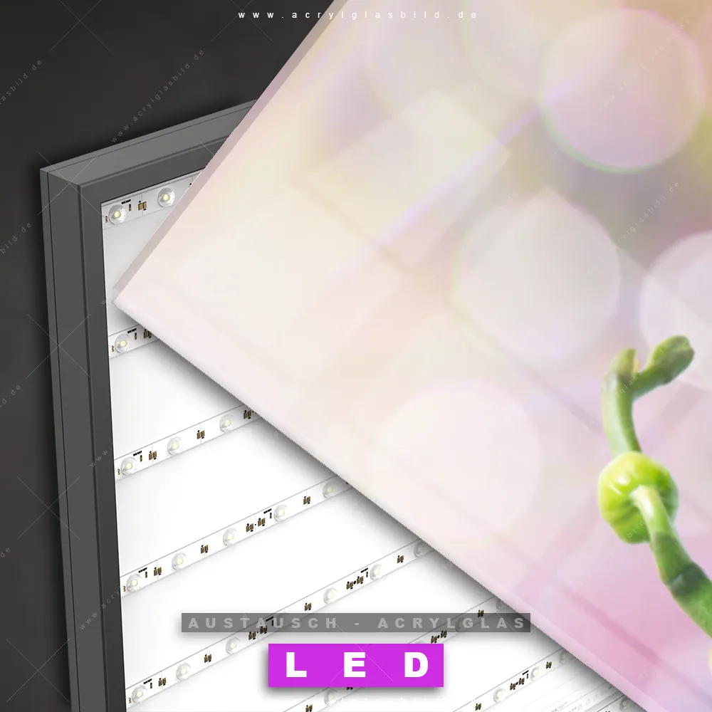Begriffe wie Blume, Blüte, Pflanze, Tropfen, Orchidee, Wasser, Spiegelung, Wasserspiegelung haben dich auf der Suche nach deinem neuen Austausch-Acrylglasbild inspiriert? Dann sollte das Wechsel-Acrylglasbild rosafarbene Orchideenblüten für dein bereits vorhandenes LED Acrylglasbild Canvalight® DIA den Weg zu dir finden.