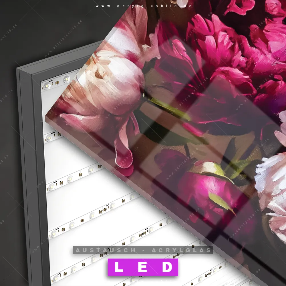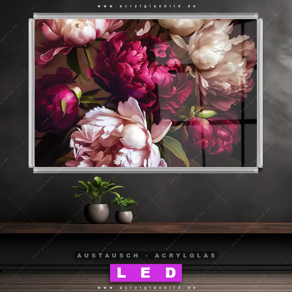 Begriffe wie Pflanze, Natur, Blüte, Nahaufnahme, Blumen, Rosen, Blüten, Malerei, Ölgemälde, Blumenstrauß, Bouquet haben dich auf der Suche nach deinem neuen Austausch-Acrylglasbild inspiriert? Dann sollte das Wechsel-Acrylglasbild Blühende Pfingstrosen mit rosafarbenen Blüten für dein bereits vorhandenes LED Acrylglasbild Canvalight® DIA den Weg zu dir finden.