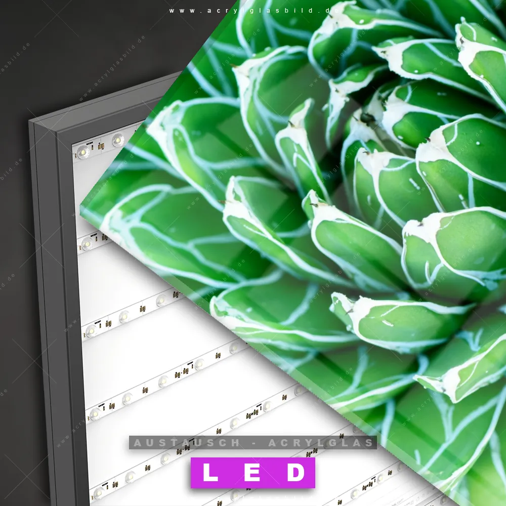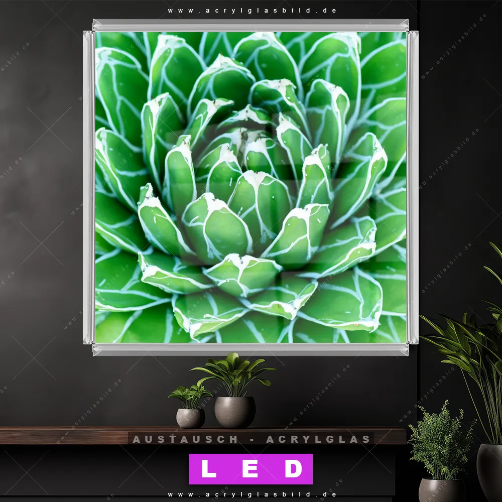 Begriffe wie Kaktus, Pflanze, Sukkulente, Close Up, Nahaufnahme, Blüte, exotisch haben dich auf der Suche nach deinem neuen Austausch-Acrylglasbild inspiriert? Dann sollte das Wechsel-Acrylglasbild Grüne Sukkulente für dein bereits vorhandenes LED Acrylglasbild Canvalight® DIA den Weg zu dir finden.