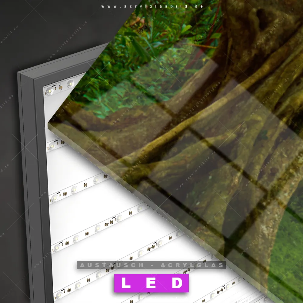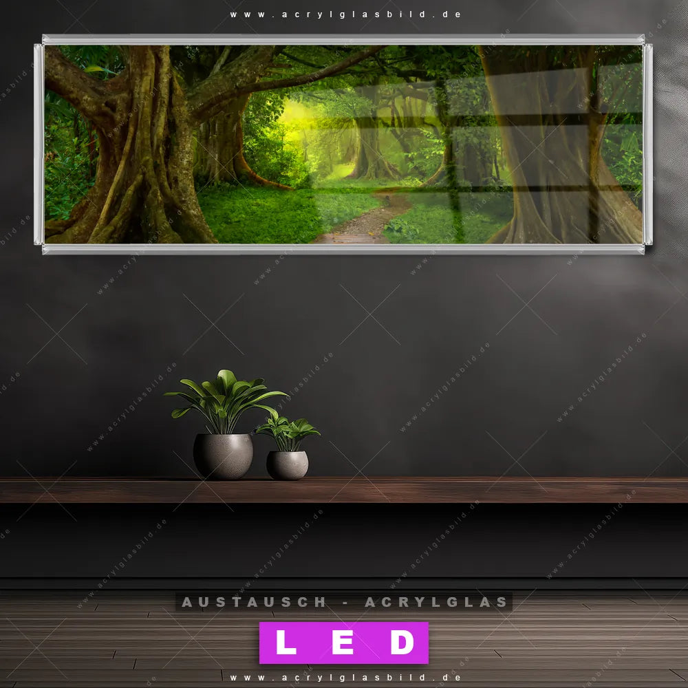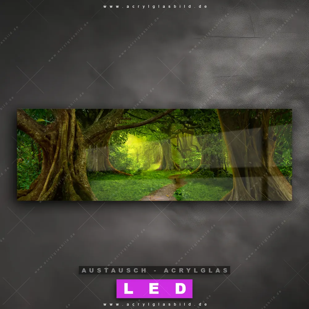 Begriffe wie Wald, Landschaft, Baum, Bäume, Natur, Baumkrone, Laubbaum, Asiatischer Wald, Dschungel, Waldweg haben dich auf der Suche nach deinem neuen Austausch-Acrylglasbild inspiriert? Dann sollte das Wechsel-Acrylglasbild Weg durch den Dschungel für dein bereits vorhandenes LED Acrylglasbild Canvalight® DIA den Weg zu dir finden.