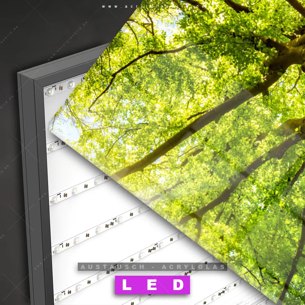 Begriffe wie Wald, Landschaft, Baum, Bäume, Natur, Baumkrone, Froschperspektive, Laubbaum, Buche haben dich auf der Suche nach deinem neuen Austausch-Acrylglasbild inspiriert? Dann sollte das Wechsel-Acrylglasbild Sonnenstrahlen durch Baumkronen für dein bereits vorhandenes LED Acrylglasbild Canvalight® DIA den Weg zu dir finden.