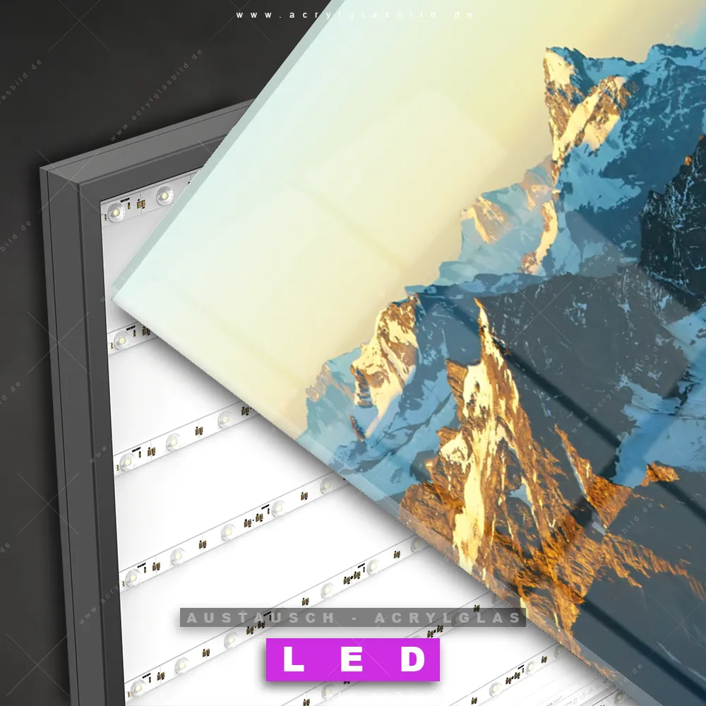 Begriffe wie Landschaft, Natur, Stille, Berge, Sonnenuntergang, Sonnenaufgang, Sonne, Gebirge, Nebel, Steine, Alpen haben dich auf der Suche nach deinem neuen Austausch-Acrylglasbild inspiriert? Dann sollte das Wechsel-Acrylglasbild Bergspitzen für dein bereits vorhandenes LED Acrylglasbild Canvalight® DIA den Weg zu dir finden.