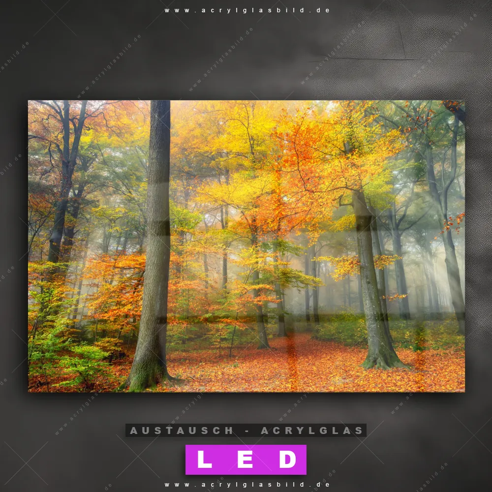 Begriffe wie Wald, Bäume, Natur, Laubwald, Nebel, Dunst, Herbst, Laub, Waldweg haben dich auf der Suche nach deinem neuen Austausch-Acrylglasbild inspiriert? Dann sollte das Wechsel-Acrylglasbild Idyllischer Herbstwald für dein bereits vorhandenes LED Acrylglasbild Canvalight® DIA den Weg zu dir finden.