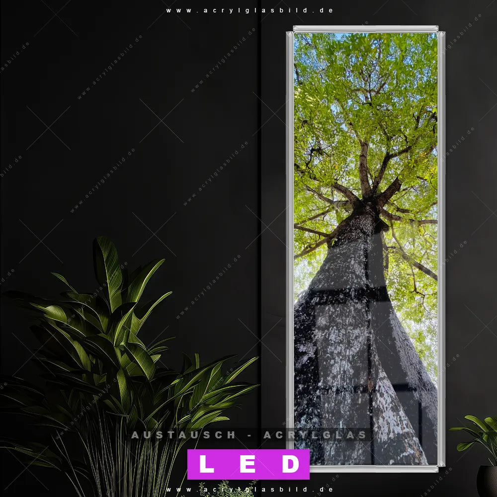 Begriffe wie Wald, Bäume, Natur, Baum, Ruhe, Stille, Baumkrone, Froschperspektive haben dich auf der Suche nach deinem neuen Austausch-Acrylglasbild inspiriert? Dann sollte das Wechsel-Acrylglasbild hohe Laubbäume für dein bereits vorhandenes LED Acrylglasbild Canvalight® DIA den Weg zu dir finden.
