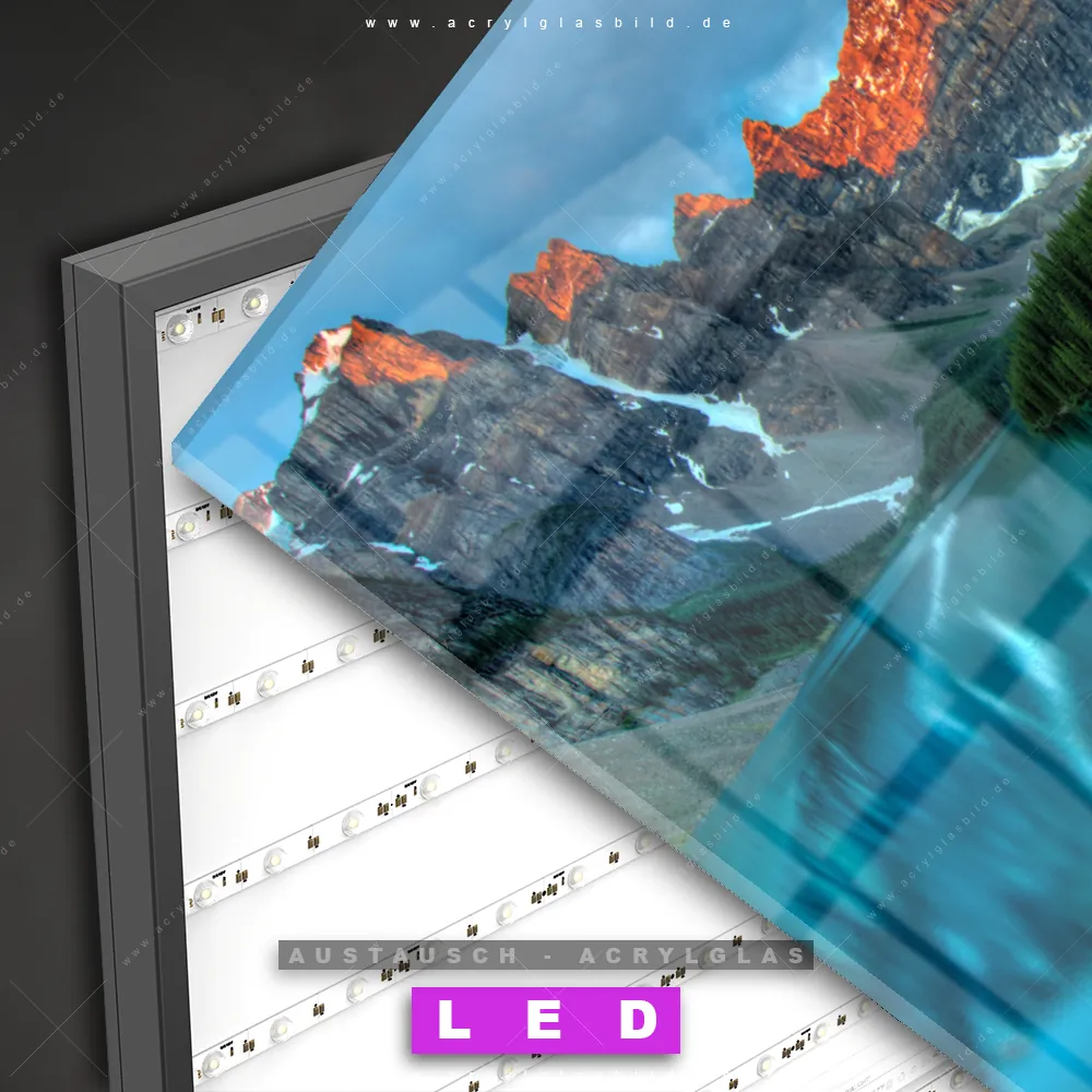 Begriffe wie Natur, Berge, See, Himmel, Landschaft, Boote, Sonnenaufgang, Spiegelung, Abenteuer, wandern haben dich auf der Suche nach deinem neuen Austausch-Acrylglasbild inspiriert? Dann sollte das Wechsel-Acrylglasbild Glühende Berggipfel am stillen See für dein bereits vorhandenes LED Acrylglasbild Canvalight® DIA den Weg zu dir finden.