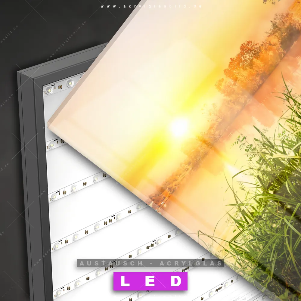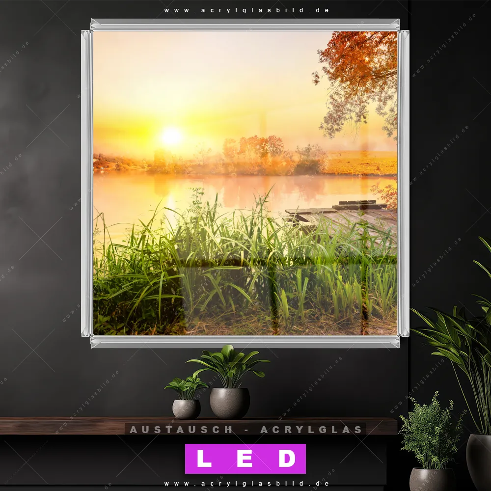 Begriffe wie Sonnenuntergang, Sonnenaufgang, Wasser, Fluss, Nebel, Morgenstimmung, See, Steg, Angeln, Teich, Herbst, fischen haben dich auf der Suche nach deinem neuen Austausch-Acrylglasbild inspiriert? Dann sollte das Wechsel-Acrylglasbild Sonnenaufgang am See für dein bereits vorhandenes LED Acrylglasbild Canvalight® DIA den Weg zu dir finden.