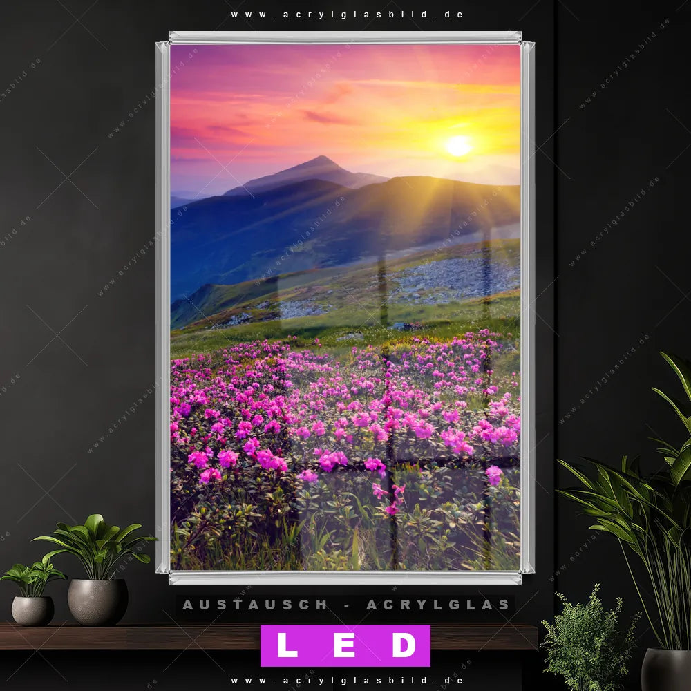 Begriffe wie Berge, Sonnenuntergang, Bergwiese, Sommer, Blumen, Blumenwiese haben dich auf der Suche nach deinem neuen Austausch-Acrylglasbild inspiriert? Dann sollte das Wechsel-Acrylglasbild blühende Wiese in den Bergen für dein bereits vorhandenes LED Acrylglasbild Canvalight® DIA den Weg zu dir finden.