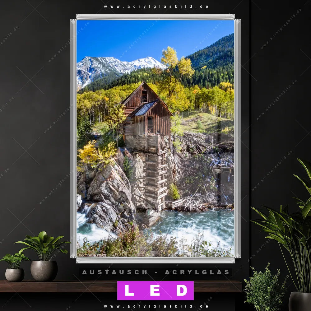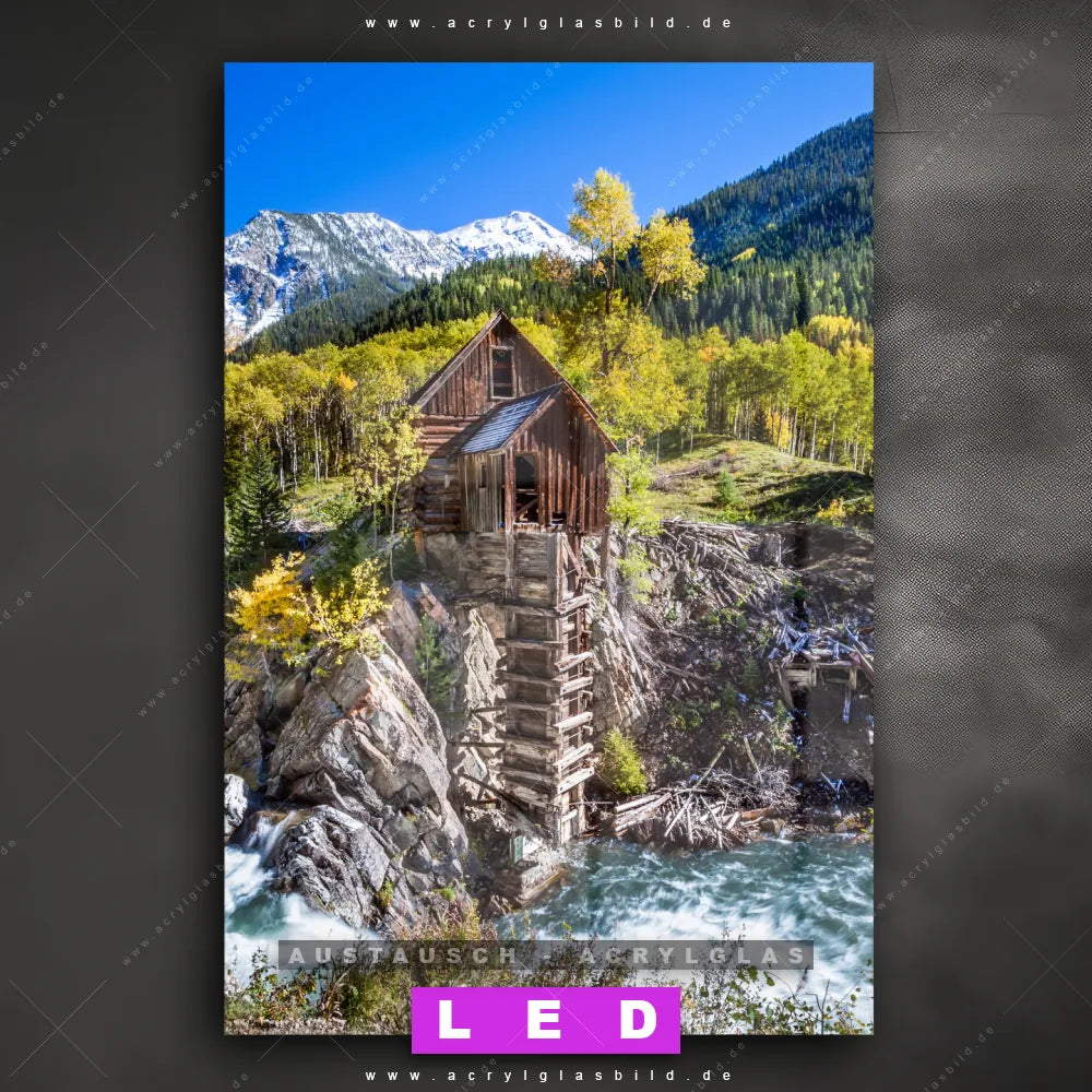 Begriffe wie Sehenswürdigkeit, USA, Fluss, Landschaft, Wald, Berge, Bäume, Felsen, Herbst haben dich auf der Suche nach deinem neuen Austausch-Acrylglasbild inspiriert? Dann sollte das Wechsel-Acrylglasbild Cristall Mill in Amerika für dein bereits vorhandenes LED Acrylglasbild Canvalight® DIA den Weg zu dir finden.