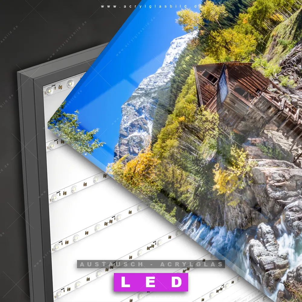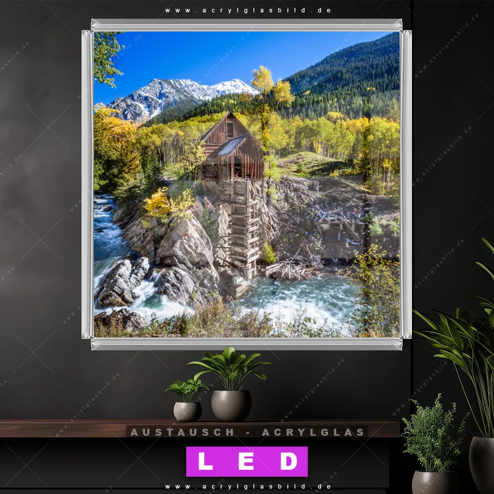 Begriffe wie Sehenswürdigkeit, USA, Fluss, Landschaft, Wald, Berge, Bäume, Felsen, Herbst haben dich auf der Suche nach deinem neuen Austausch-Acrylglasbild inspiriert? Dann sollte das Wechsel-Acrylglasbild Cristall Mill in Amerika für dein bereits vorhandenes LED Acrylglasbild Canvalight® DIA den Weg zu dir finden.