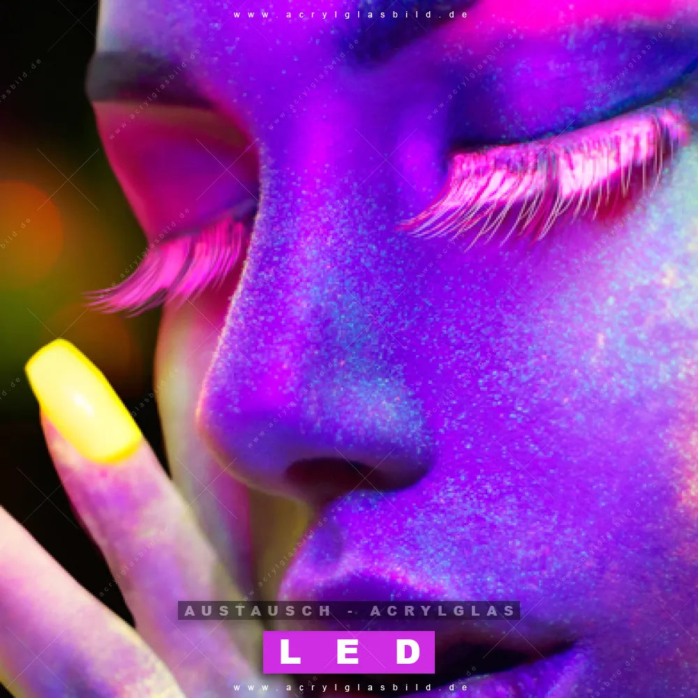 Begriffe wie Frau, Porträt, Farbe, Beauty, Gesicht, Körper, Neon, Neonlicht, Make-up haben dich auf der Suche nach deinem neuen Austausch-Acrylglasbild inspiriert? Dann sollte das Wechsel-Acrylglasbild Neonfarben auf der Haut für dein bereits vorhandenes LED Acrylglasbild Canvalight® DIA den Weg zu dir finden.