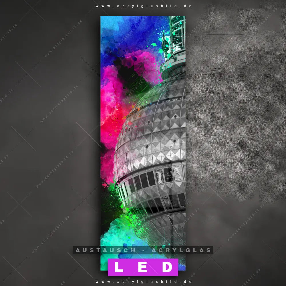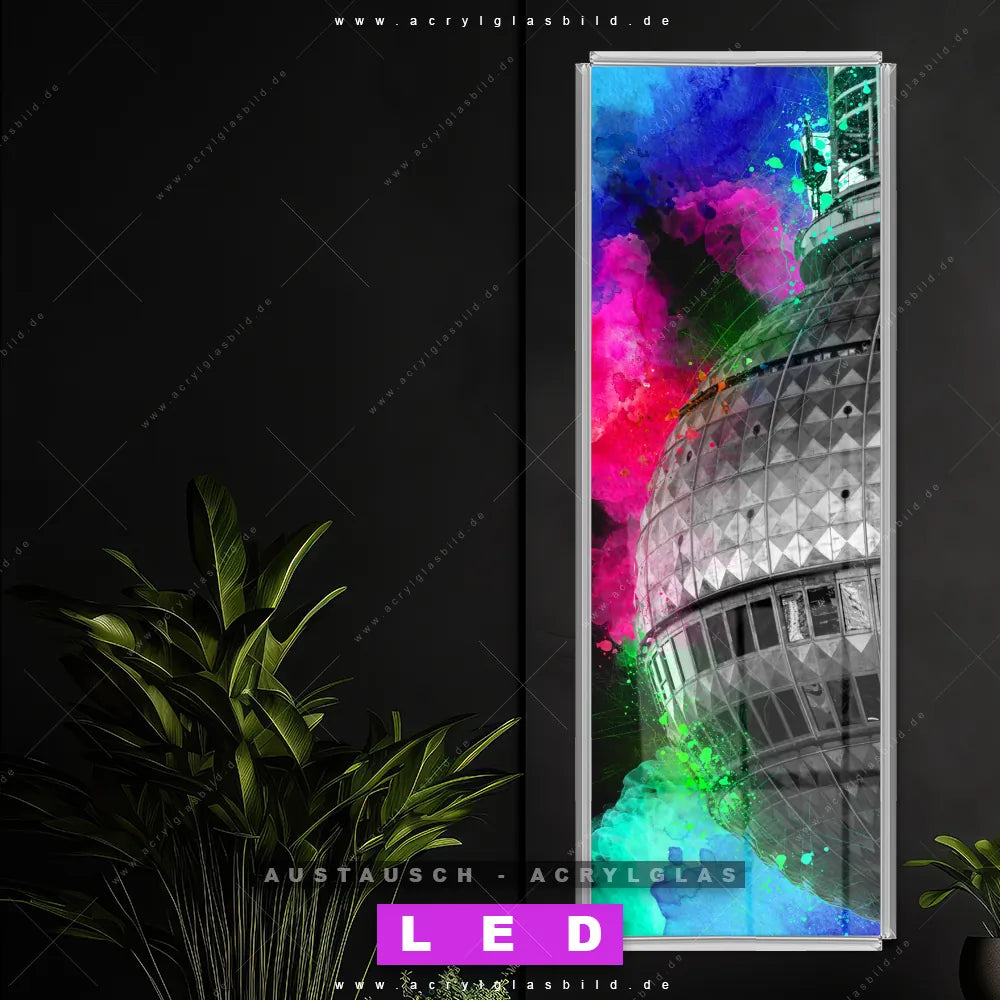 Begriffe wie Pop Art, Kunst, bunt, Deutschland, Sehenswürdigkeit, Berlin, Fernsehturm, Farbspritzer haben dich auf der Suche nach deinem neuen Austausch-Acrylglasbild inspiriert? Dann sollte das Wechsel-Acrylglasbild Berliner Fernsehturm in Aquarwllnebel für dein bereits vorhandenes LED Acrylglasbild Canvalight® DIA den Weg zu dir finden.