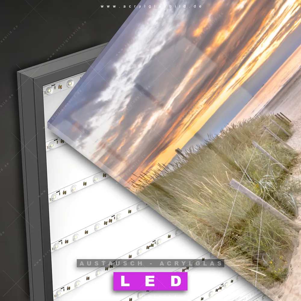 Begriffe wie Sommer, Deutschland, Dünen, Gräser, Sonnenuntergang - Sonnenaufgang, Ostsee - Nordsee, Urlaub - Reisen, Strandweg haben dich auf der Suche nach deinem neuen Austausch-Acrylglasbild inspiriert? Dann sollte das Wechsel-Acrylglasbild Weg zum Strand mit Gräsern für dein bereits vorhandenes LED Acrylglasbild Canvalight® DIA den Weg zu dir finden.