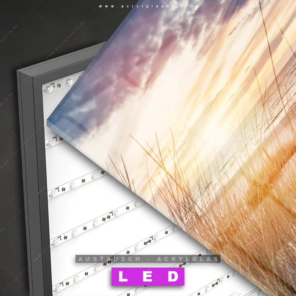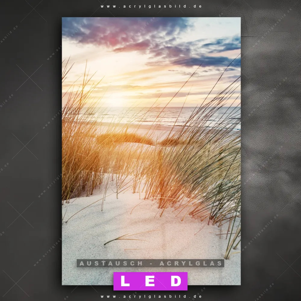 Begriffe wie Deutschland, Sommer, Ostsee - Nordsee, Urlaub - Reisen, Sonnenuntergang - Sonnenaufgang, Dünen, Gräser, Frühling haben dich auf der Suche nach deinem neuen Austausch-Acrylglasbild inspiriert? Dann sollte das Wechsel-Acrylglasbild Sonne hinter den Dünen für dein bereits vorhandenes LED Acrylglasbild Canvalight® DIA den Weg zu dir finden.