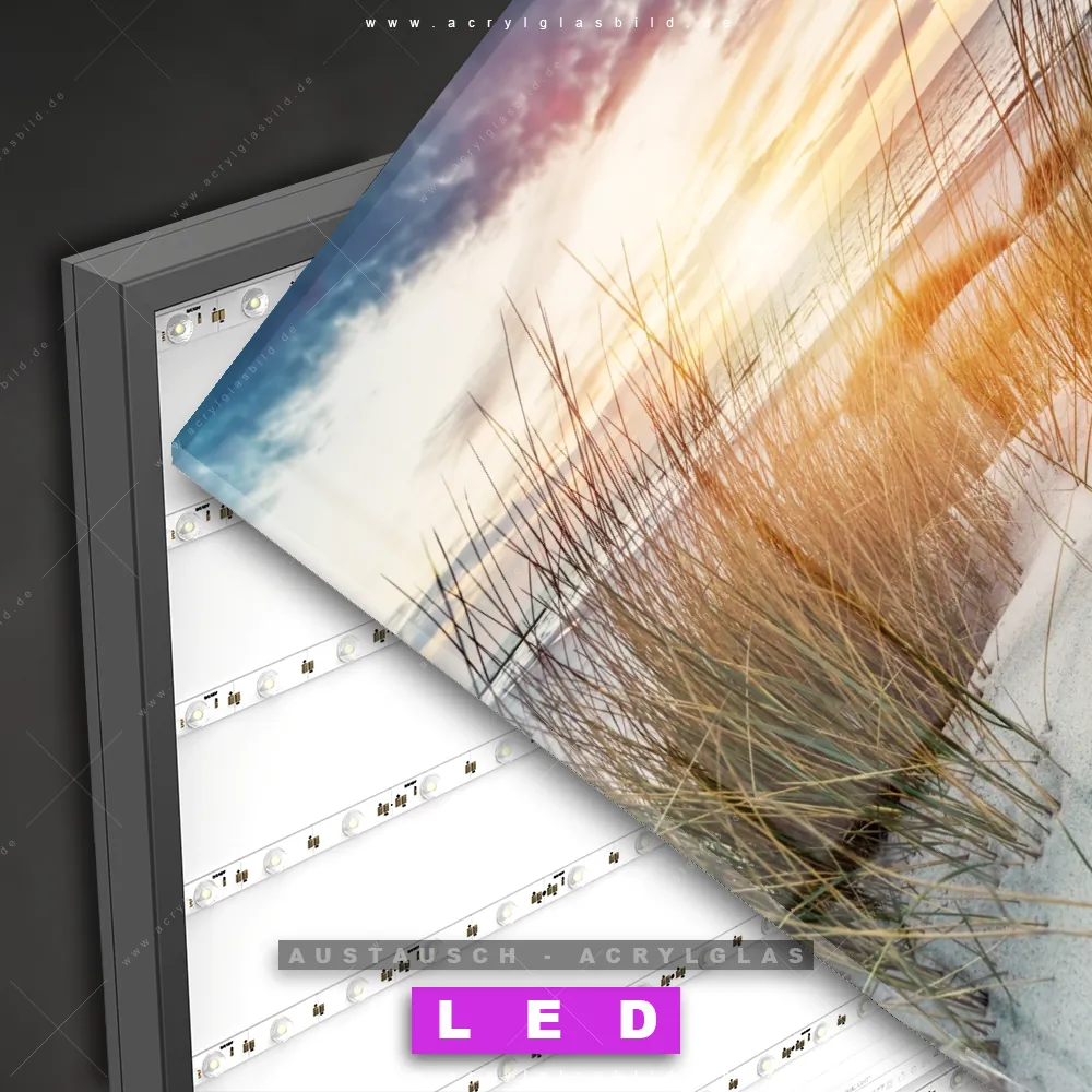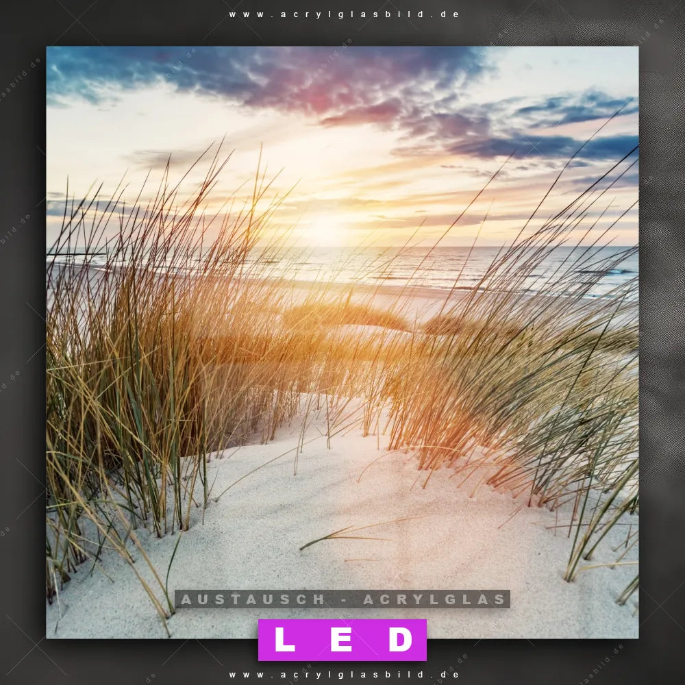 Begriffe wie Deutschland, Sommer, Ostsee - Nordsee, Urlaub - Reisen, Sonnenuntergang - Sonnenaufgang, Dünen, Gräser, Frühling haben dich auf der Suche nach deinem neuen Austausch-Acrylglasbild inspiriert? Dann sollte das Wechsel-Acrylglasbild Sonne hinter den Dünen für dein bereits vorhandenes LED Acrylglasbild Canvalight® DIA den Weg zu dir finden.