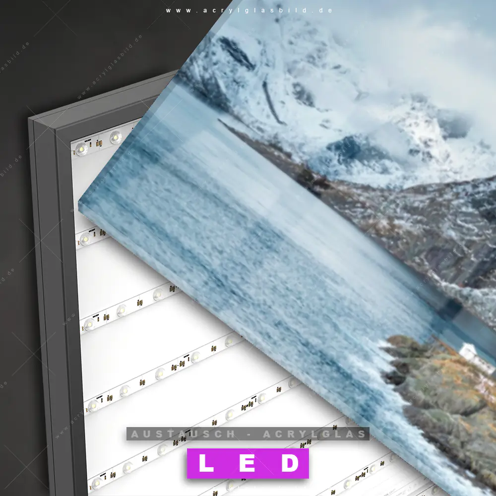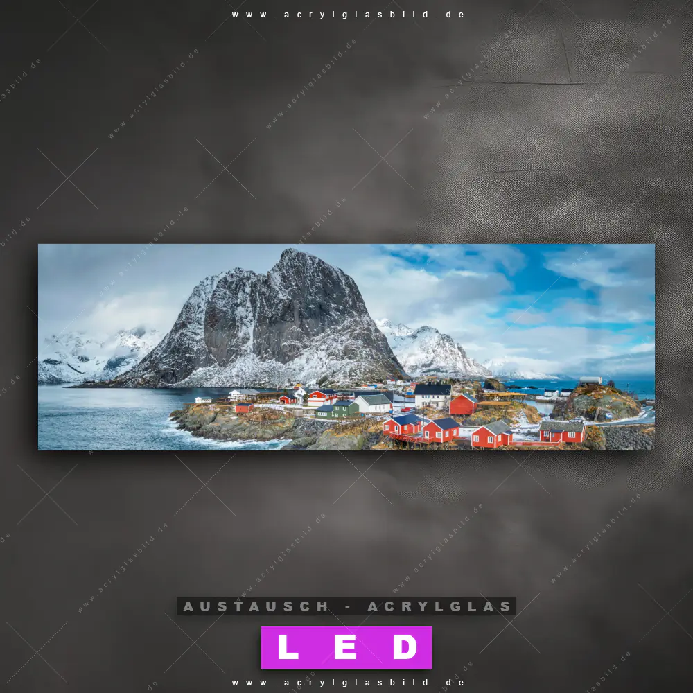 Begriffe wie Skandinavien, Norwegen, See, Natur, Dorf, Steg, Fjord, Winter, Meer, Häuser, Berge haben dich auf der Suche nach deinem neuen Austausch-Acrylglasbild inspiriert? Dann sollte das Wechsel-Acrylglasbild Skandinavische Küste für dein bereits vorhandenes LED Acrylglasbild Canvalight® DIA den Weg zu dir finden.