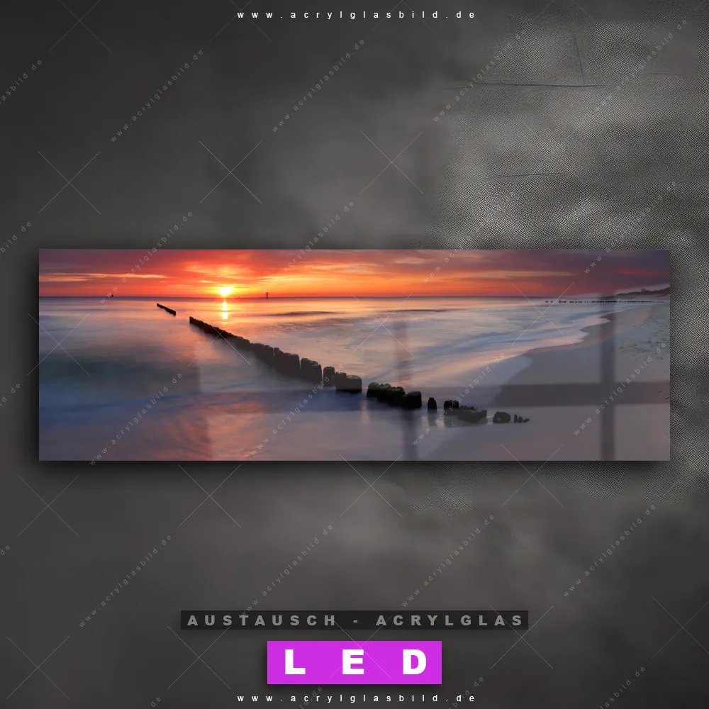 Begriffe wie Deutschland, Sommer, Urlaub - Reisen, Ostsee - Nordsee, Sonnenuntergang - Sonnenaufgang, Wellenbrecher, Buhnen haben dich auf der Suche nach deinem neuen Austausch-Acrylglasbild inspiriert? Dann sollte das Wechsel-Acrylglasbild Sonnenuntergang am Strand für dein bereits vorhandenes LED Acrylglasbild Canvalight® DIA den Weg zu dir finden.