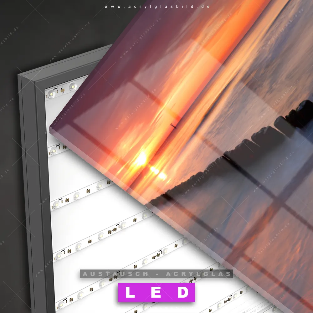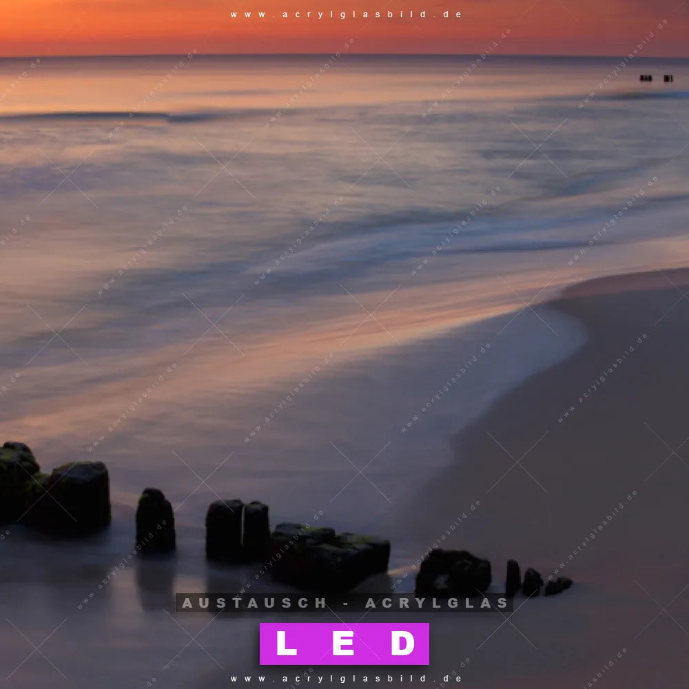 Begriffe wie Deutschland, Sommer, Urlaub - Reisen, Ostsee - Nordsee, Sonnenuntergang - Sonnenaufgang, Wellenbrecher, Buhnen haben dich auf der Suche nach deinem neuen Austausch-Acrylglasbild inspiriert? Dann sollte das Wechsel-Acrylglasbild Sonnenuntergang am Strand für dein bereits vorhandenes LED Acrylglasbild Canvalight® DIA den Weg zu dir finden.
