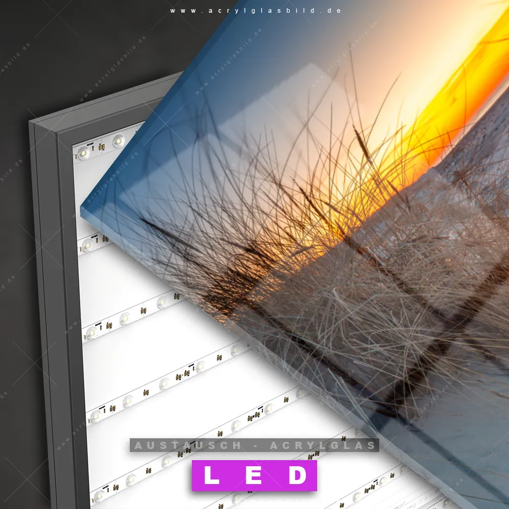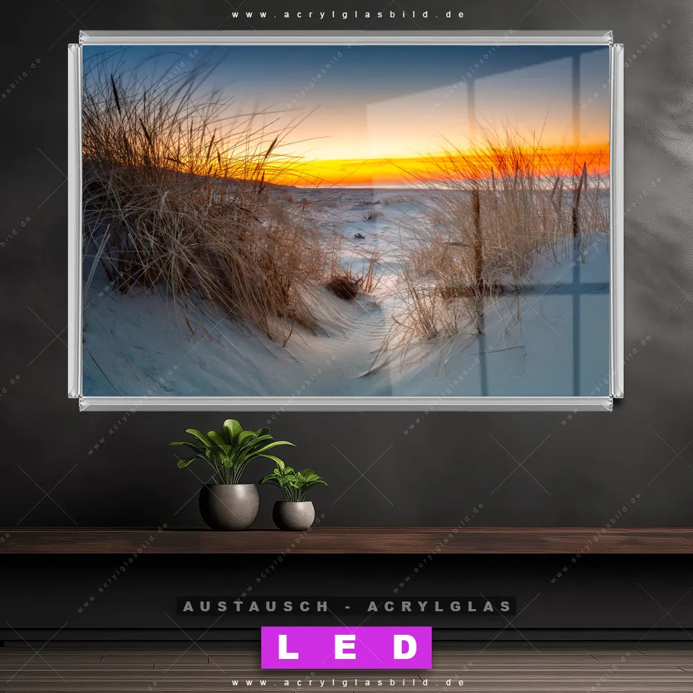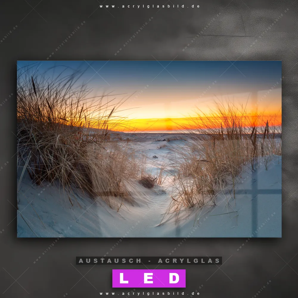 Begriffe wie Deutschland, Herbst, Sommer, Urlaub - Reisen, Ostsee - Nordsee, Sonnenuntergang - Sonnenaufgang, Frühling, Sand, Dünen, Gräser haben dich auf der Suche nach deinem neuen Austausch-Acrylglasbild inspiriert? Dann sollte das Wechsel-Acrylglasbild Abendstimmung am Strand für dein bereits vorhandenes LED Acrylglasbild Canvalight® DIA den Weg zu dir finden.