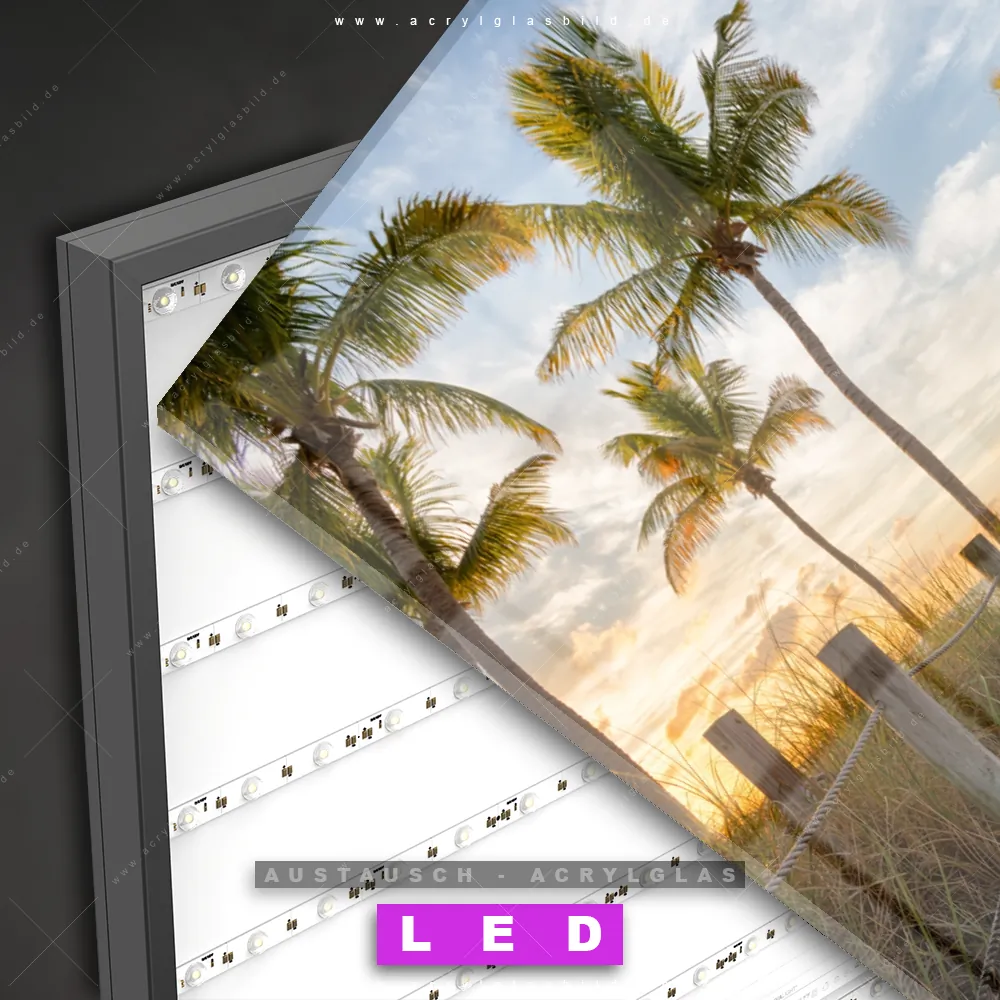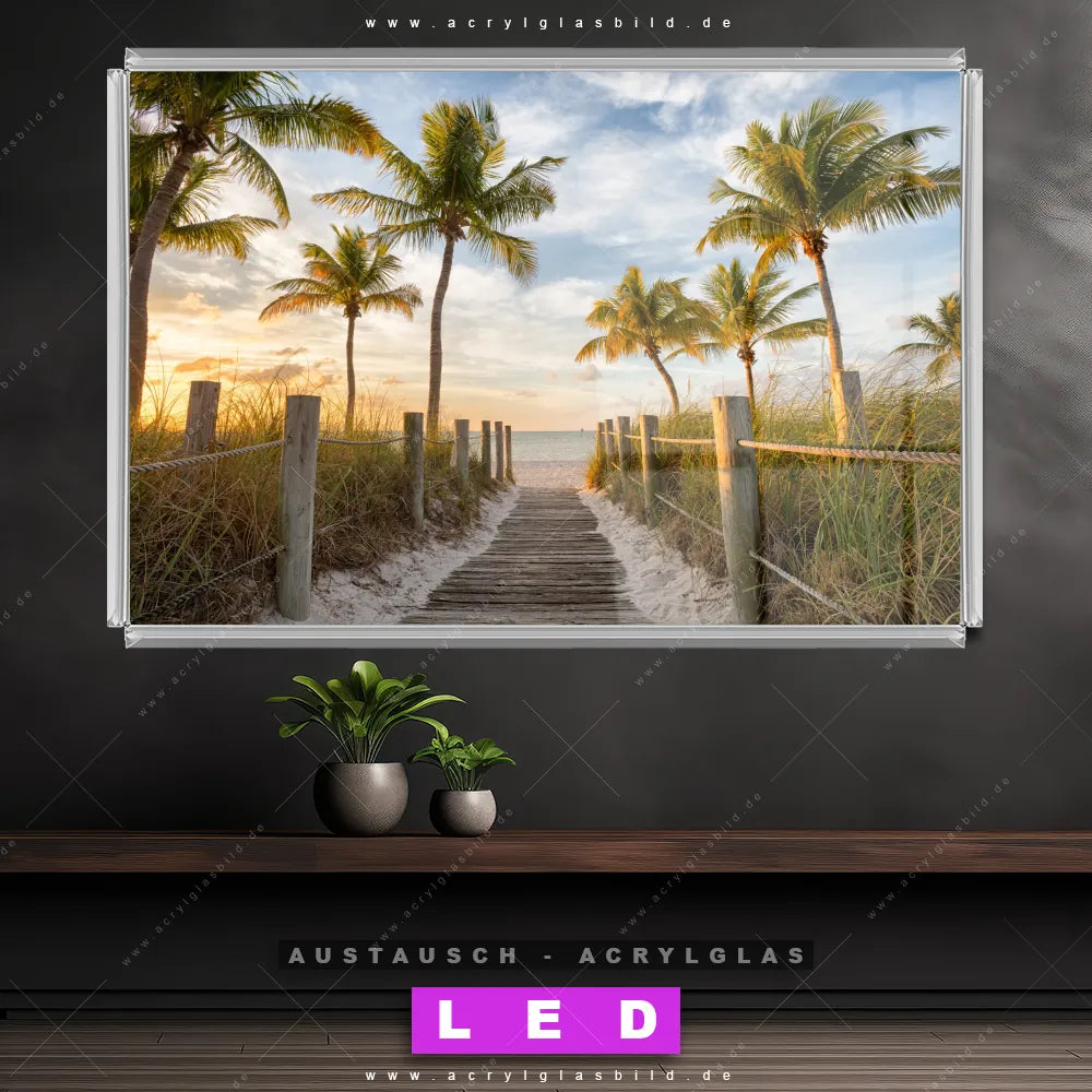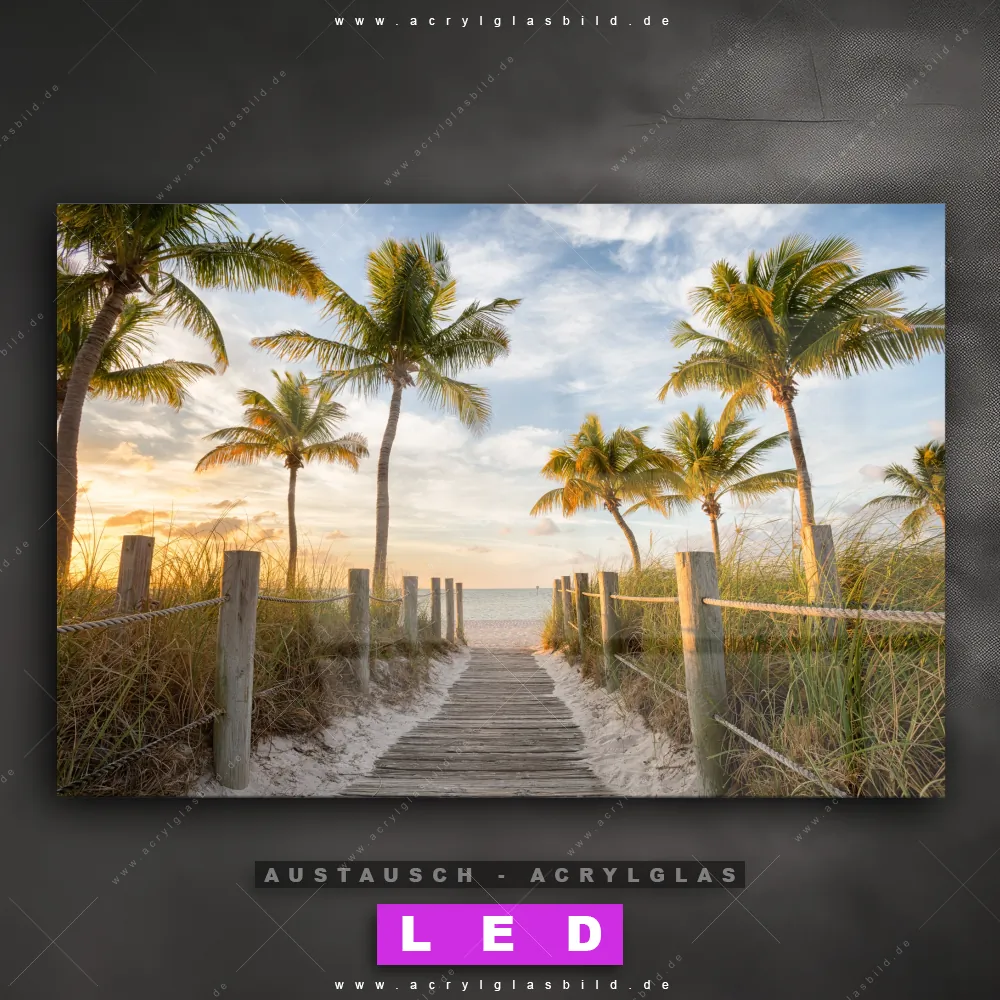 Begriffe wie Strand, Sand, Steg, Weg, Palmen, Südsee - Karibik, Urlaub - Reisen, Sonnenuntergang - Sonnenaufgang haben dich auf der Suche nach deinem neuen Austausch-Acrylglasbild inspiriert? Dann sollte das Wechsel-Acrylglasbild Sommertag am Strand für dein bereits vorhandenes LED Acrylglasbild Canvalight® DIA den Weg zu dir finden.