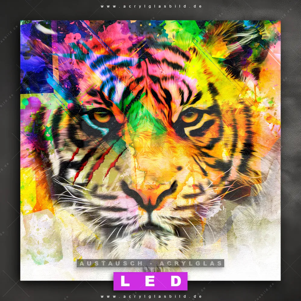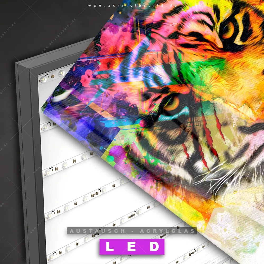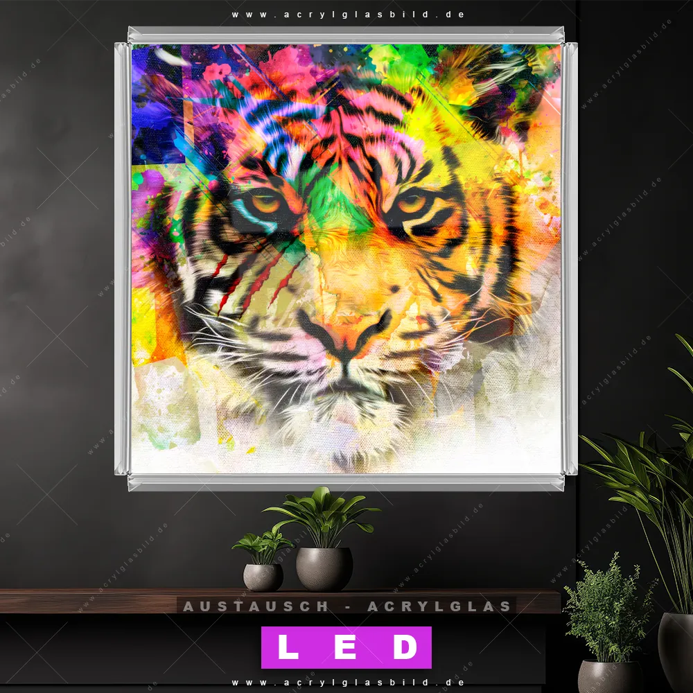 Begriffe wie Raubkatze, Tiger, Afrika, Dschungel, Farbspritzer, Farbe, Farbexplosion, Portät haben dich auf der Suche nach deinem neuen Austausch-Acrylglasbild inspiriert? Dann sollte das Wechsel-Acrylglasbild bunter Tiger für dein bereits vorhandenes LED Acrylglasbild Canvalight® DIA den Weg zu dir finden.