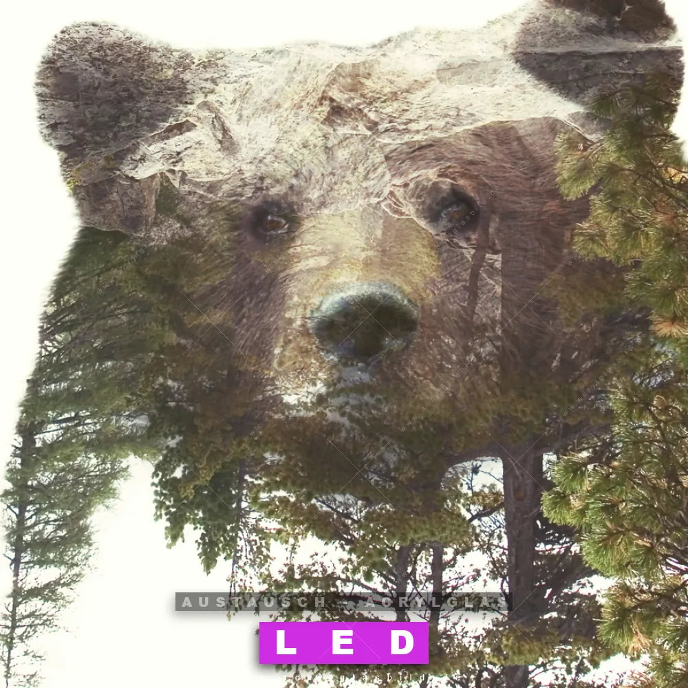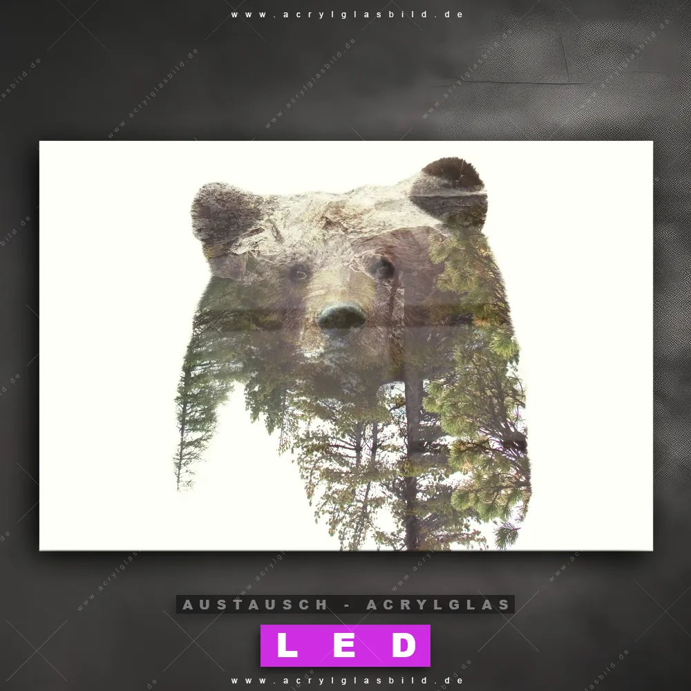 Begriffe wie Bär, Wald, Doppelbelichtung, Natur, skandinavisch, Bäume haben dich auf der Suche nach deinem neuen Austausch-Acrylglasbild inspiriert? Dann sollte das Wechsel-Acrylglasbild Bärenkopf mit Bäumen für dein bereits vorhandenes LED Acrylglasbild Canvalight® DIA den Weg zu dir finden.