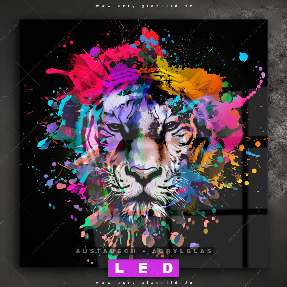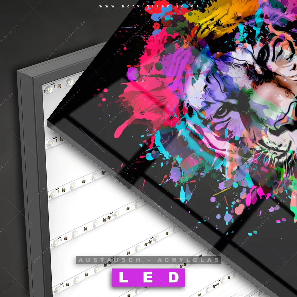 Begriffe wie Raubkatze, Tiger, Afrika, Dschungel, Splash, Farbspritzer, Farbexplosion, Farbe, Porträt haben dich auf der Suche nach deinem neuen Austausch-Acrylglasbild inspiriert? Dann sollte das Wechsel-Acrylglasbild Tiger in Farbvielfalt für dein bereits vorhandenes LED Acrylglasbild Canvalight® DIA den Weg zu dir finden.