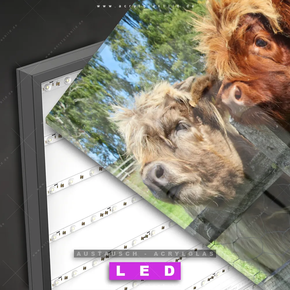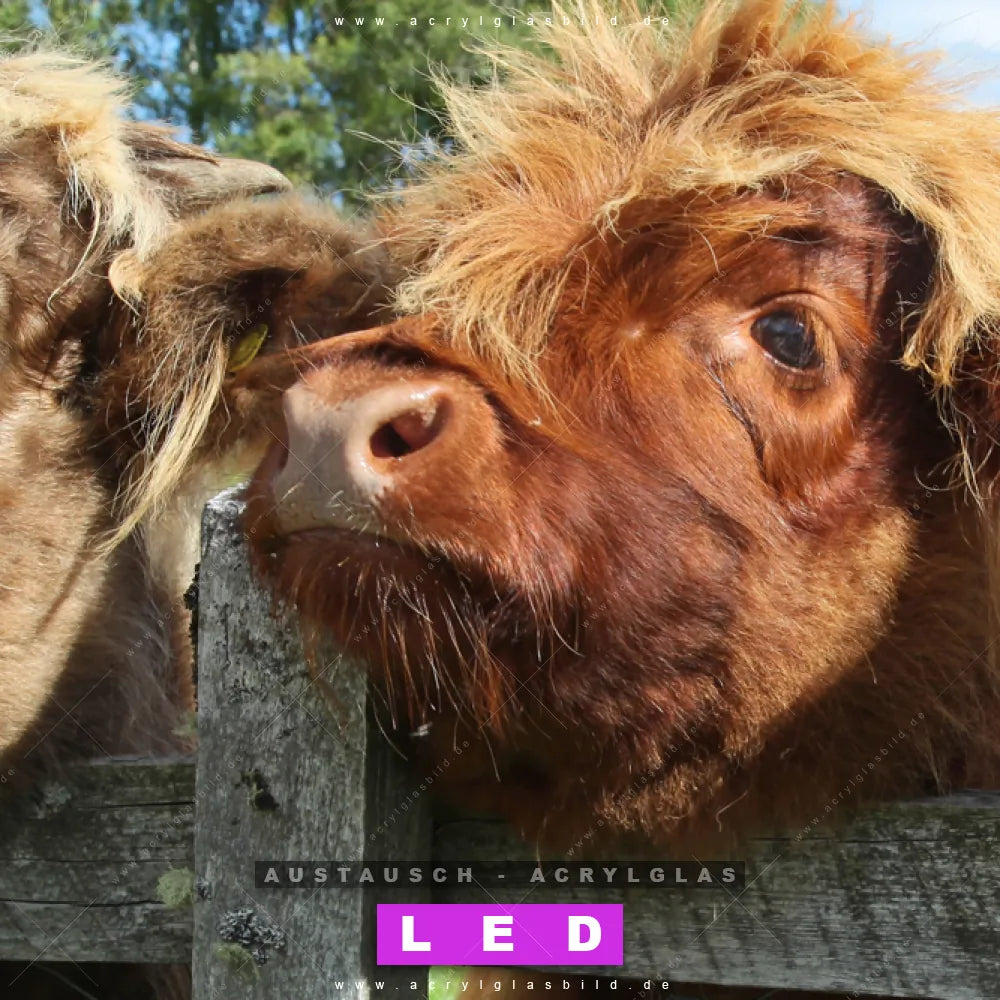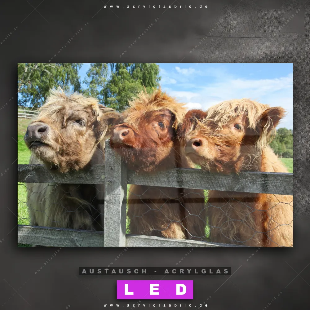 Begriffe wie Tier, Stier, Hochlandkuh, Highlander, Büffel, Rind, Bulle, Hochlandrind, Kuh, Weide, Weidezaun haben dich auf der Suche nach deinem neuen Austausch-Acrylglasbild inspiriert? Dann sollte das Wechsel-Acrylglasbild Schottland-Rinder für dein bereits vorhandenes LED Acrylglasbild Canvalight® DIA den Weg zu dir finden.