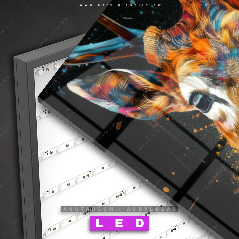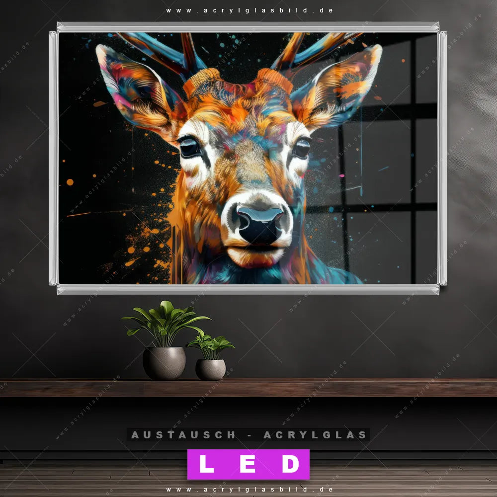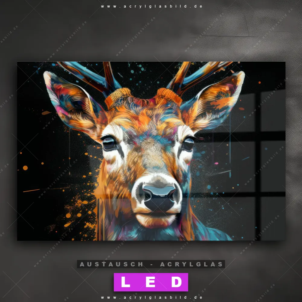 Begriffe wie Hirsch, Natur, Rotwild, Wald, Farbspritzer, Farbexplosion haben dich auf der Suche nach deinem neuen Austausch-Acrylglasbild inspiriert? Dann sollte das Wechsel-Acrylglasbild Abstraktes Porträt eines Hirsches für dein bereits vorhandenes LED Acrylglasbild Canvalight® DIA den Weg zu dir finden.