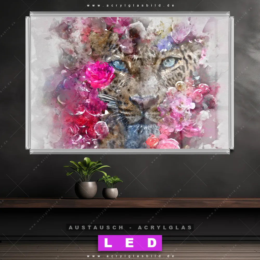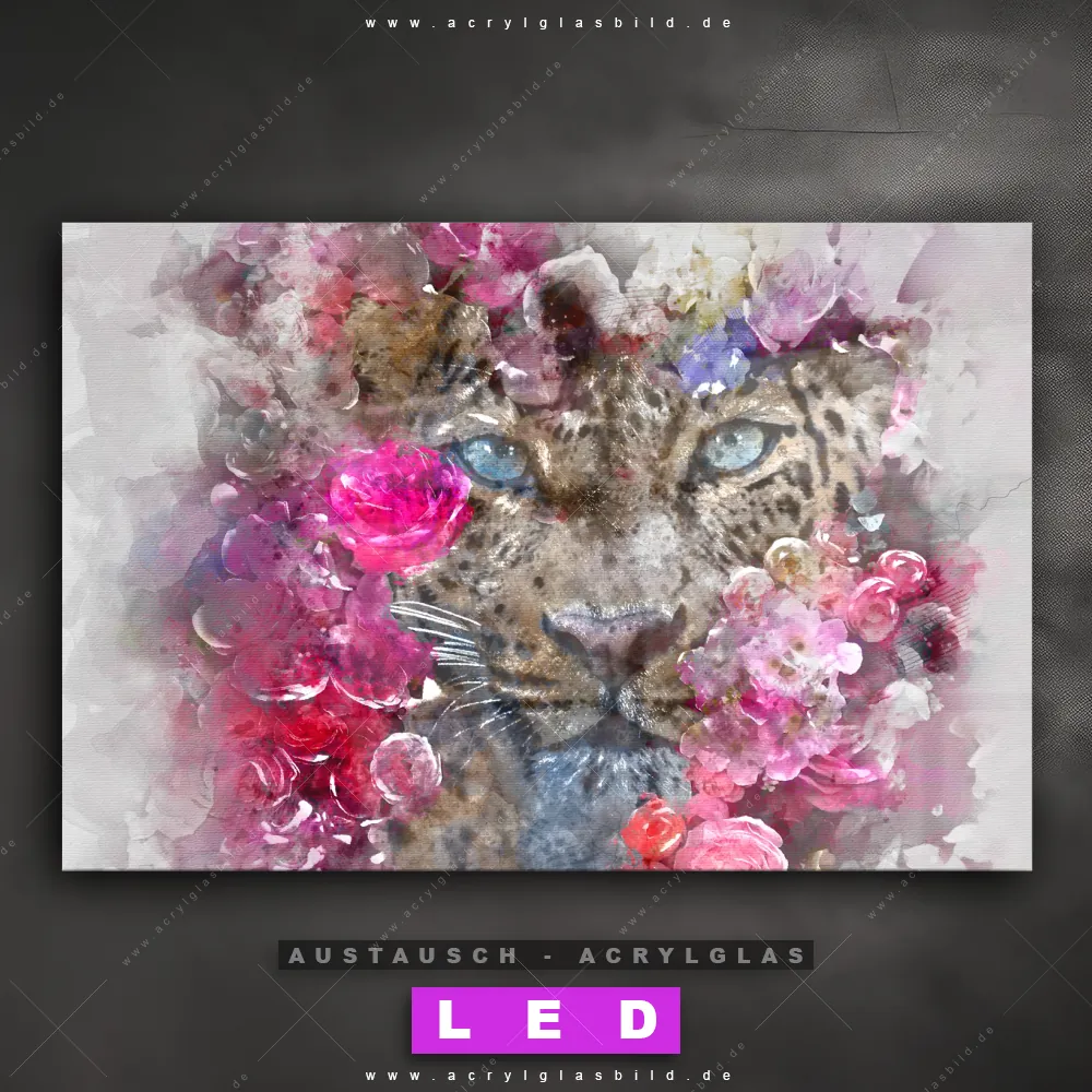 Begriffe wie Tiere & Blumen, Tier, Blumen, Leopard, Kunst, Aquarell, Jaguar, Gepard, Raubkatze, Blüten, Rosen haben dich auf der Suche nach deinem neuen Austausch-Acrylglasbild inspiriert? Dann sollte das Wechsel-Acrylglasbild Leopard umhüllt von aquarellierten Blüten für dein bereits vorhandenes LED Acrylglasbild Canvalight® DIA den Weg zu dir finden.