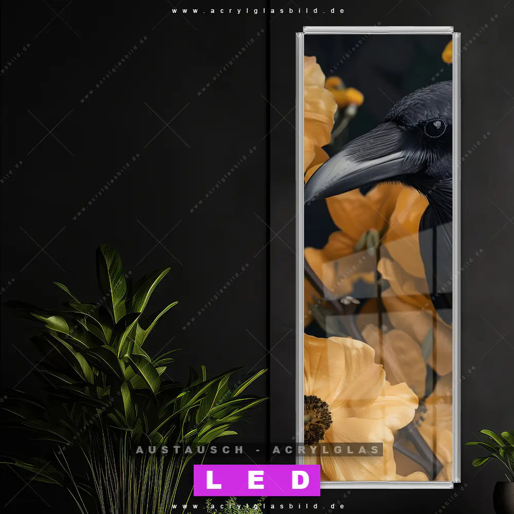 Begriffe wie Vogel, Blumen, Blüten, Natur, Pflanzen, Tierporträt, Rabe, Krähe haben dich auf der Suche nach deinem neuen Austausch-Acrylglasbild inspiriert? Dann sollte das Wechsel-Acrylglasbild Mystischer Rabe mit Blumen für dein bereits vorhandenes LED Acrylglasbild Canvalight® DIA den Weg zu dir finden.